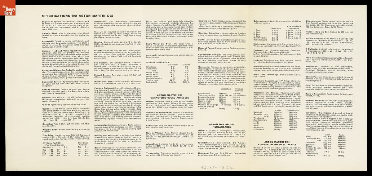 British automaker Aston Martin produced the DB5 from 1963 to 1965. Its name honored David Brown, who owned the company from 1947 to 1972. Though a remarkable automobile in its own right, with a body designed by Italian coachbuilder Carrozzeria Touring Superleggera, the DB5 is best known for its role as James Bond's car in the 1964 spy movie Goldfinger.