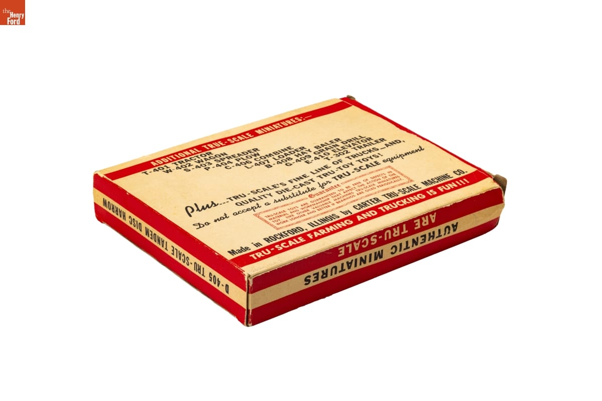 ADDITIONAL TRU-SCALE MINIATURES:- / [...] / Plus...TRU-SCALE'S FINE LINE OF TRUCKS _AND, / QUALITY DIE-CAST TRU-TOY TOYS! / Do not accept a substitute for TRU-SCALE equipment / Guarantee / [...] / Made in ROCKFORD, ILLINOIS by CARTER TRU-SCALE MACHINE CO. / TRU-SCALE FARMING AND TRUCKING IS FUN!!!