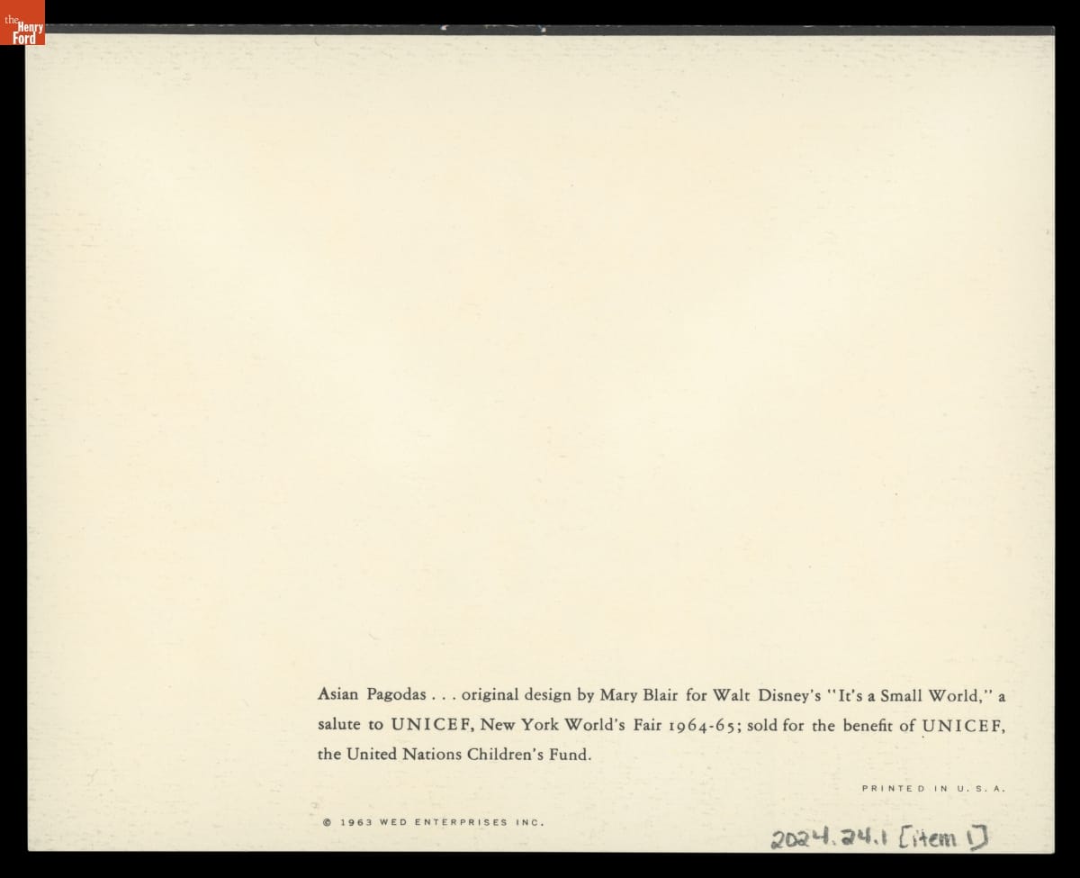 Designer and color stylist Mary Blair (1911-1978) was known for her colorful, vibrant, and imaginative style. In 1940, she began working for Walt Disney Studios, where she was involved with several films and projects, including the "It's a Small World" attraction for the 1964-65 New York World's Fair. This UNICEF greeting card uses artwork Mary created for the ride.