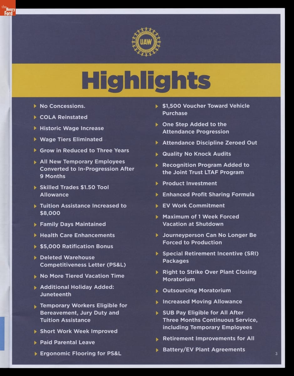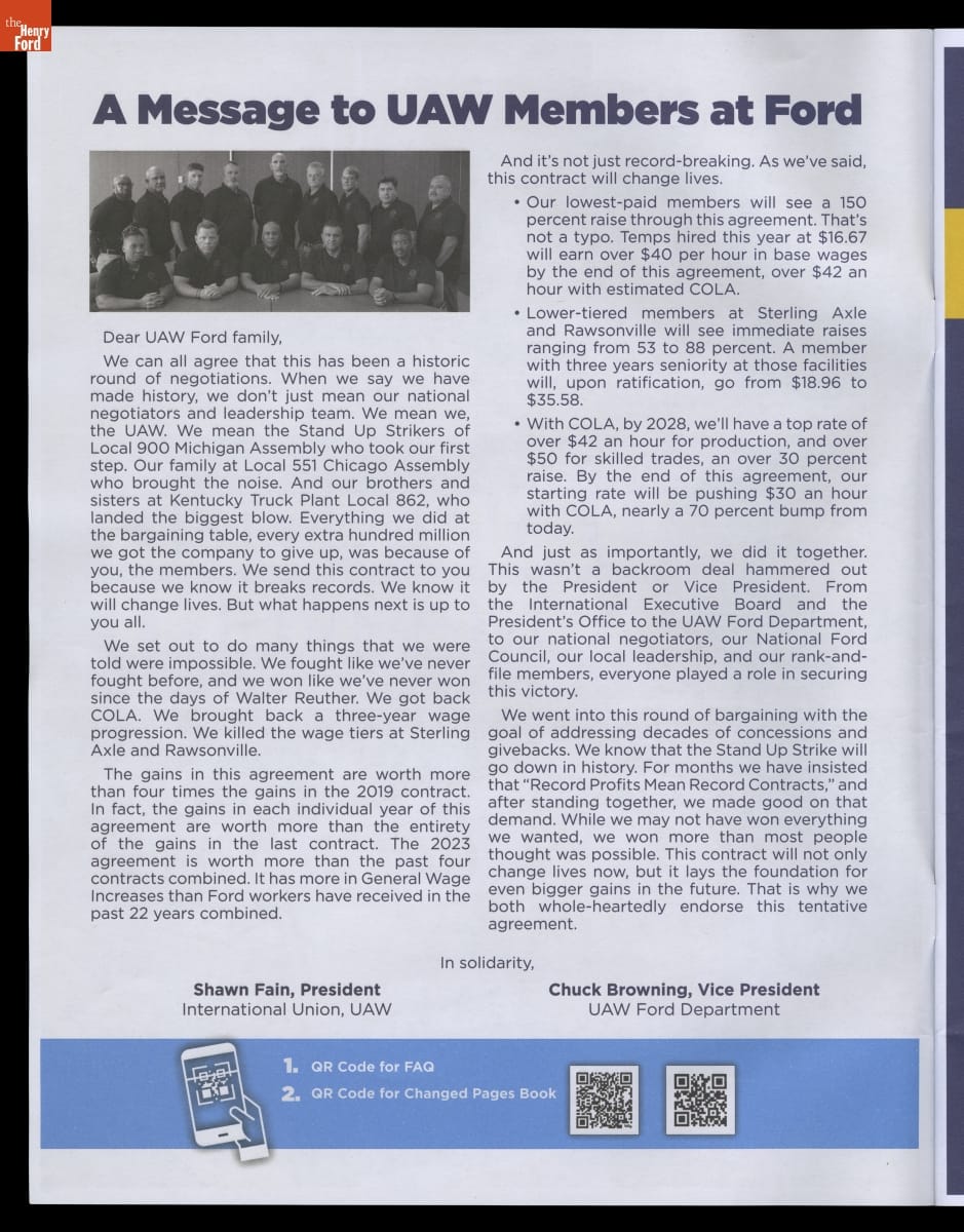 In fall 2023, United Auto Workers staged successful strikes against Ford, General Motors and Stellantis -- the union's first simultaneous actions against the Detroit Three. Workers struck for better pay and protection from job losses in the shift to electric vehicles. This booklet explained the UAW's tentative agreement with Ford, reached on October 25.