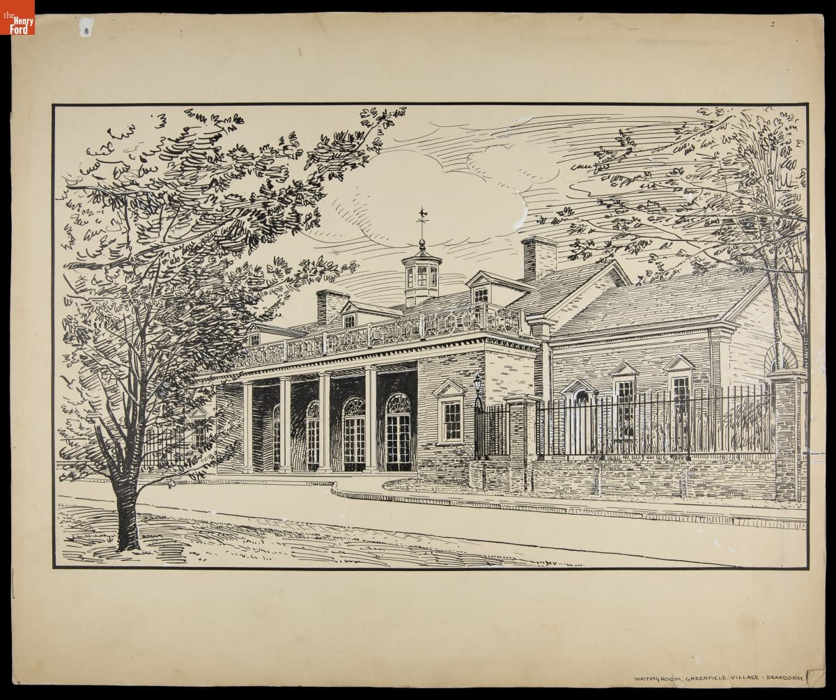 Irving Bacon, a Ford Motor Company employee and Henry Ford's personal artist, created pen-and-ink drawings to illustrate guidebooks for the Edison Institute Museum and Greenfield Village (now The Henry Ford) when they officially opened to the public in 1933. An illustrated souvenir guidebook helped visitors navigate the exhibits and grounds. Ford also used these drawings in other company publications.