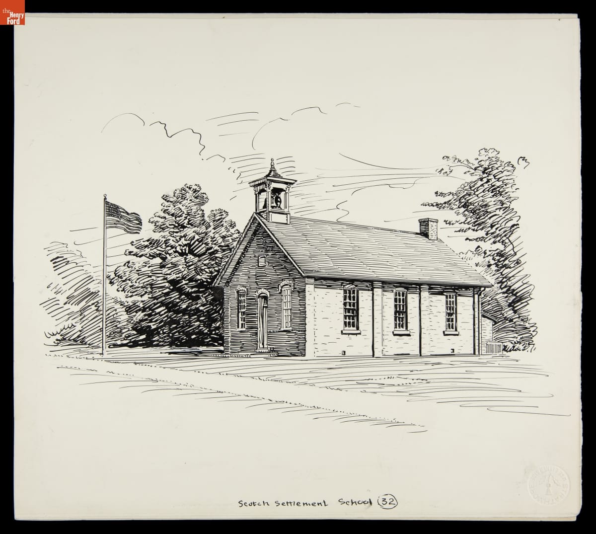 Irving Bacon, a Ford Motor Company employee and Henry Ford's personal artist, created pen-and-ink drawings to illustrate guidebooks for the Edison Institute Museum and Greenfield Village (now The Henry Ford) when they officially opened to the public in 1933. An illustrated souvenir guidebook helped visitors navigate the exhibits and grounds. Ford also used these drawings in other company publications.