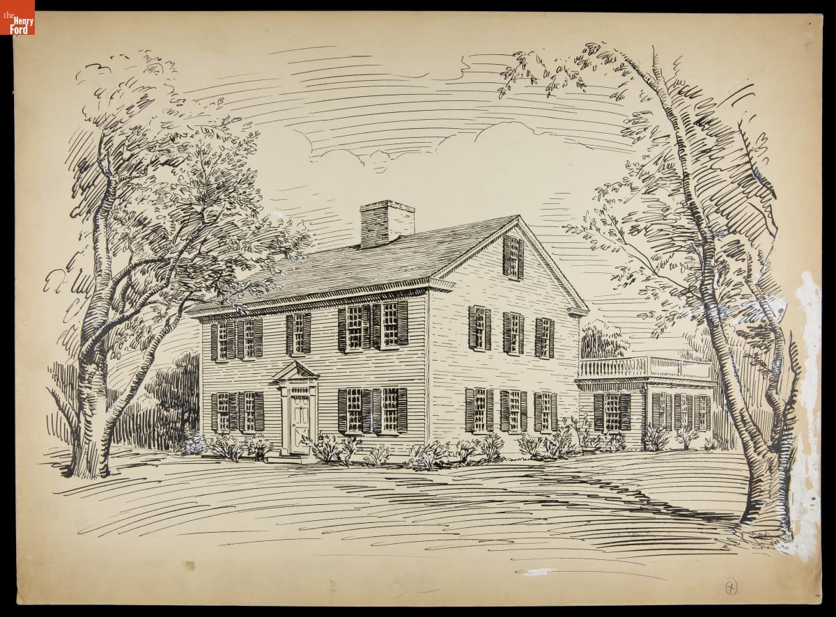 Irving Bacon, a Ford Motor Company employee and Henry Ford's personal artist, created pen-and-ink drawings to illustrate guidebooks for the Edison Institute Museum and Greenfield Village (now The Henry Ford) when they officially opened to the public in 1933. An illustrated souvenir guidebook helped visitors navigate the exhibits and grounds. Ford also used these drawings in other company publications.