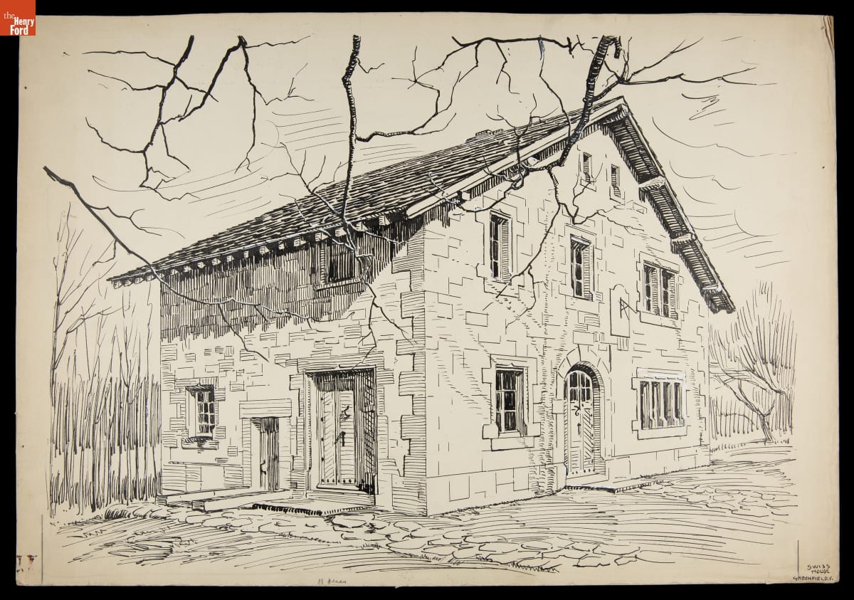 Irving Bacon, a Ford Motor Company employee and Henry Ford's personal artist, created pen-and-ink drawings to illustrate guidebooks for the Edison Institute Museum and Greenfield Village (now The Henry Ford) when they officially opened to the public in 1933. An illustrated souvenir guidebook helped visitors navigate the exhibits and grounds. Ford also used these drawings in other company publications.
