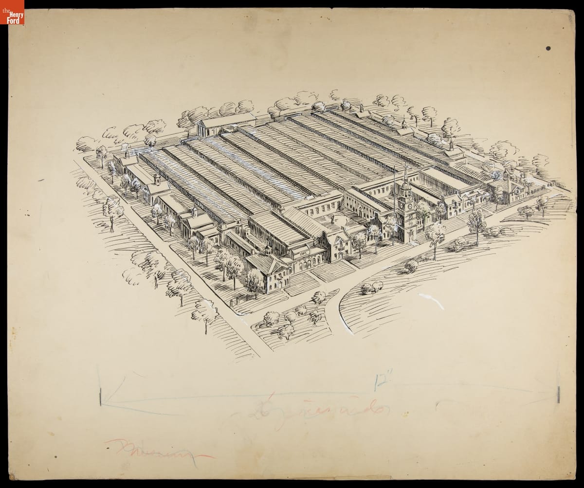 Irving Bacon, a Ford Motor Company employee and Henry Ford's personal artist, created pen-and-ink drawings to illustrate guidebooks for the Edison Institute Museum and Greenfield Village (now The Henry Ford) when they officially opened to the public in 1933. An illustrated souvenir guidebook helped visitors navigate the exhibits and grounds. Ford also used these drawings in other company publications.