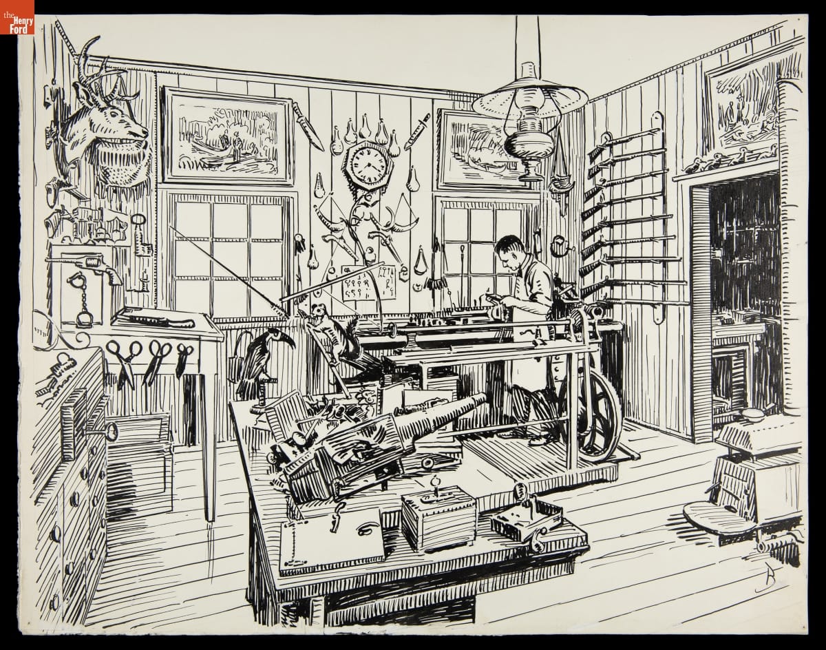 Henry Ford encouraged and appreciated the work of artist and illustrator Irving Bacon. In 1915, Bacon joined the Photographic Department of Ford Motor Company after he returned from studying art in Europe. Over the next thirty years, Bacon painted scenes depicting Ford's life, created portraiture, and illustrated articles for company publications. This drawing depicts the Street of Shops exhibit in the Henry Ford Museum.