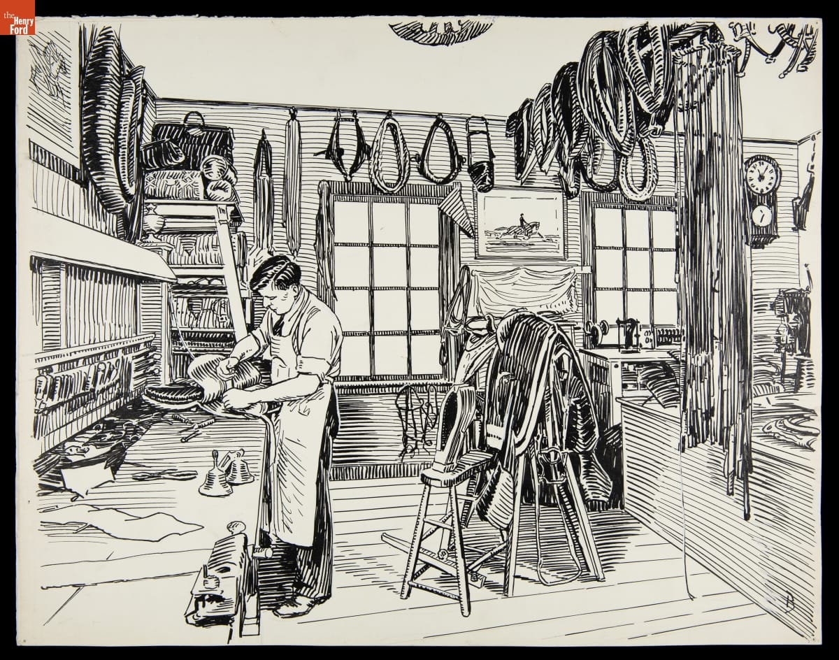Henry Ford encouraged and appreciated the work of artist and illustrator Irving Bacon. In 1915, Bacon joined the Photographic Department of Ford Motor Company after he returned from studying art in Europe. Over the next thirty years, Bacon painted scenes depicting Ford's life, created portraiture, and illustrated articles for company publications. This drawing depicts the Street of Shops exhibit in the Henry Ford Museum.