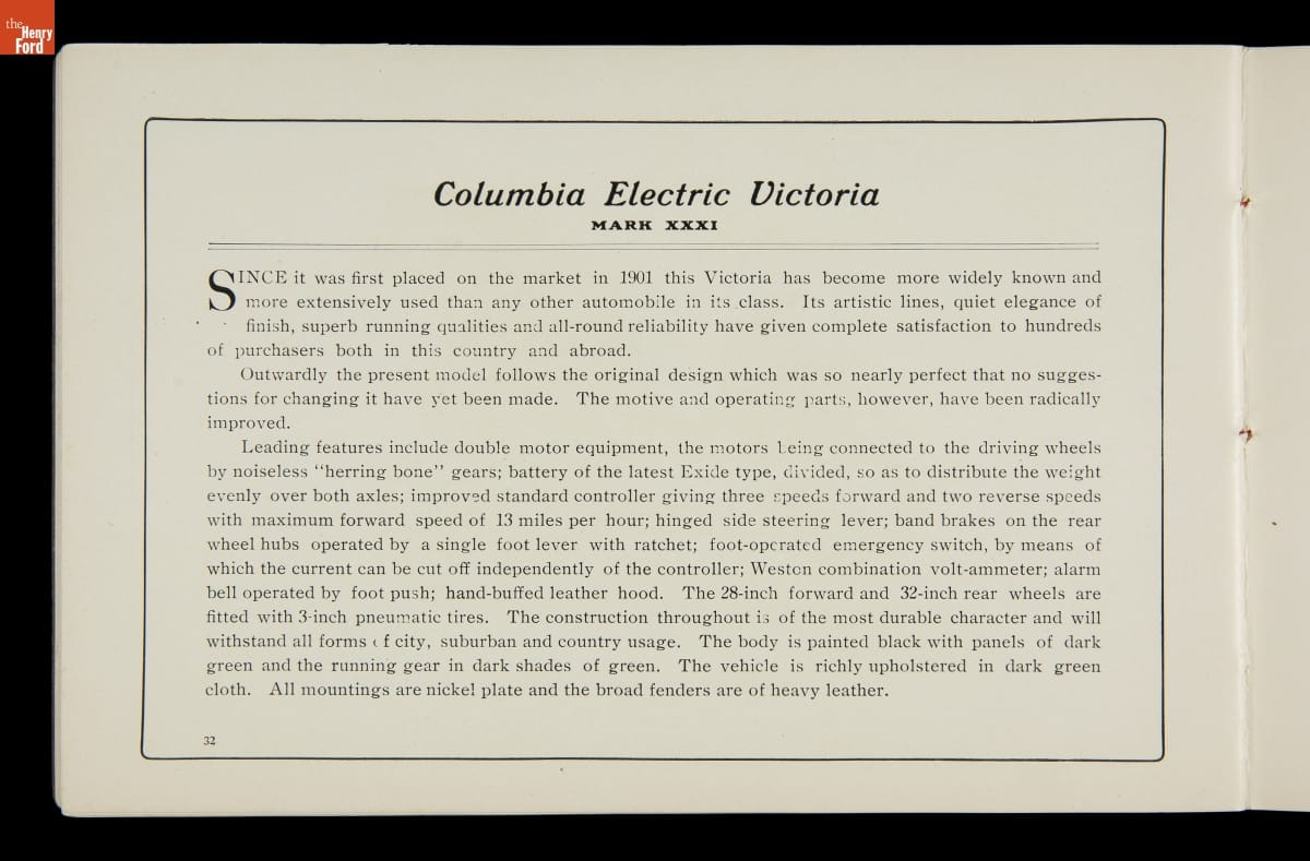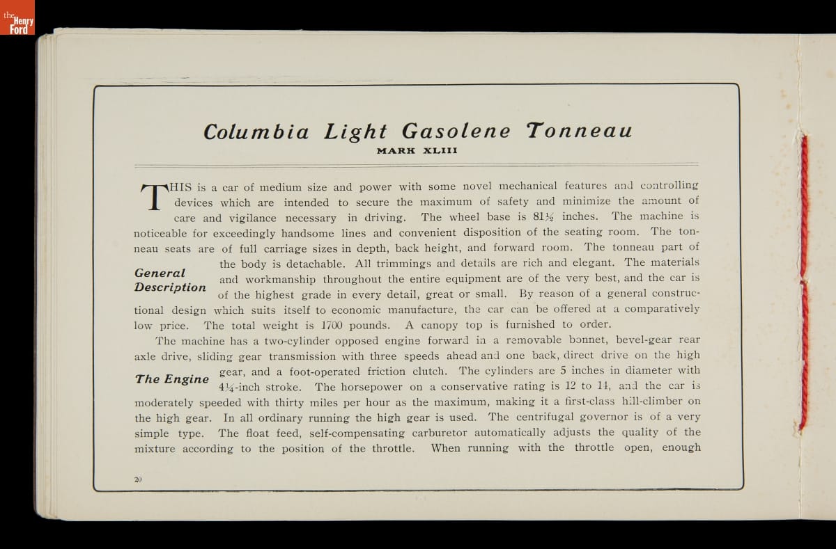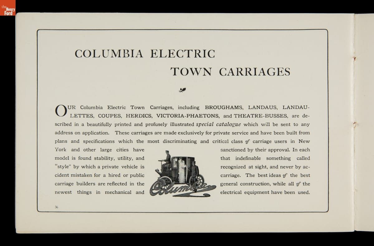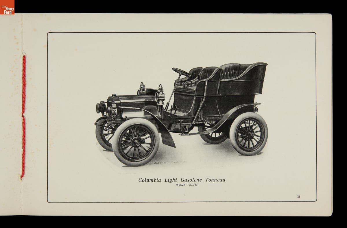 Columbia, built by the Pope Manufacturing Company of Hartford, Connecticut, was America's leading bicycle brand in the late 19th century. Founder Albert A. Pope hoped to duplicate that success with automobiles. Both electric and gasoline Columbia motor vehicles were produced in a range of body styles. But high prices hampered sales, and the last Columbia cars were built in 1913.
