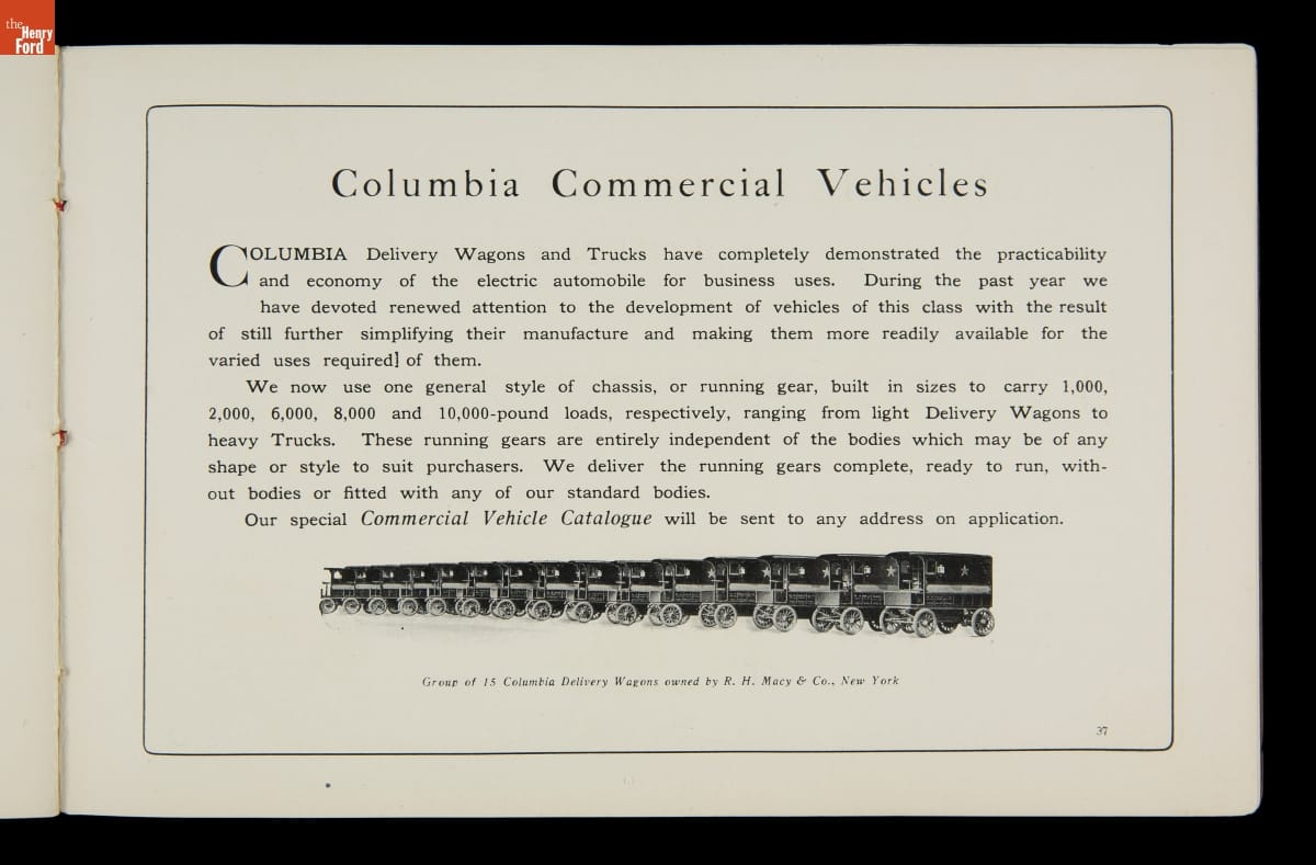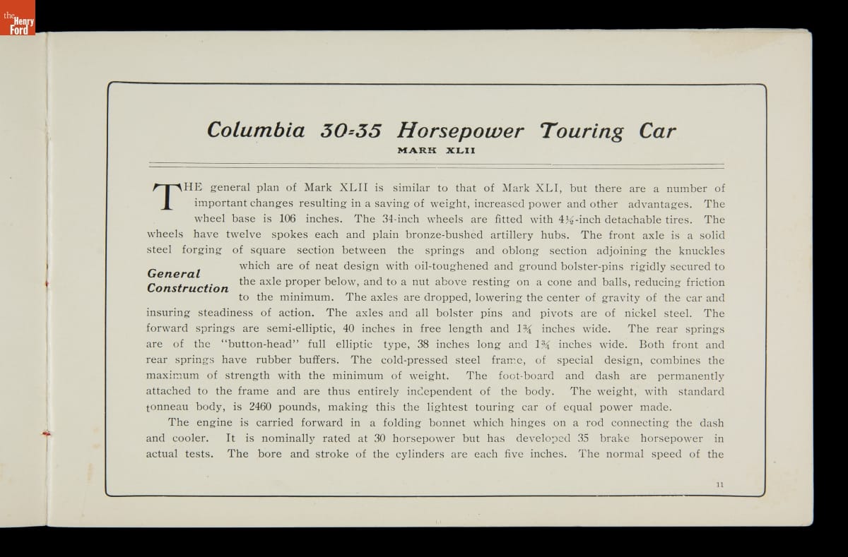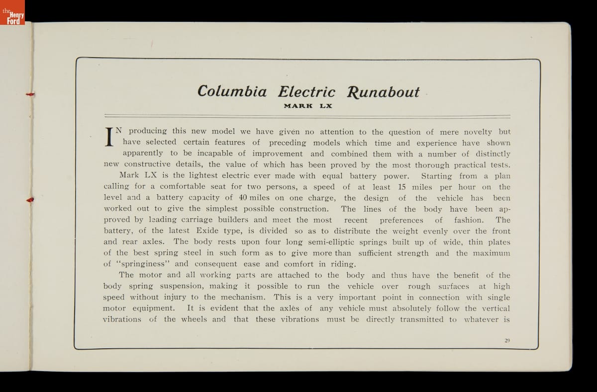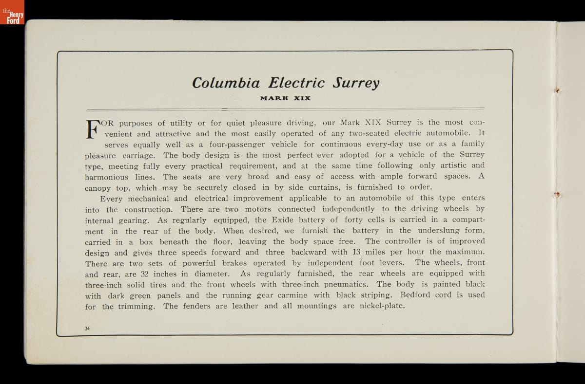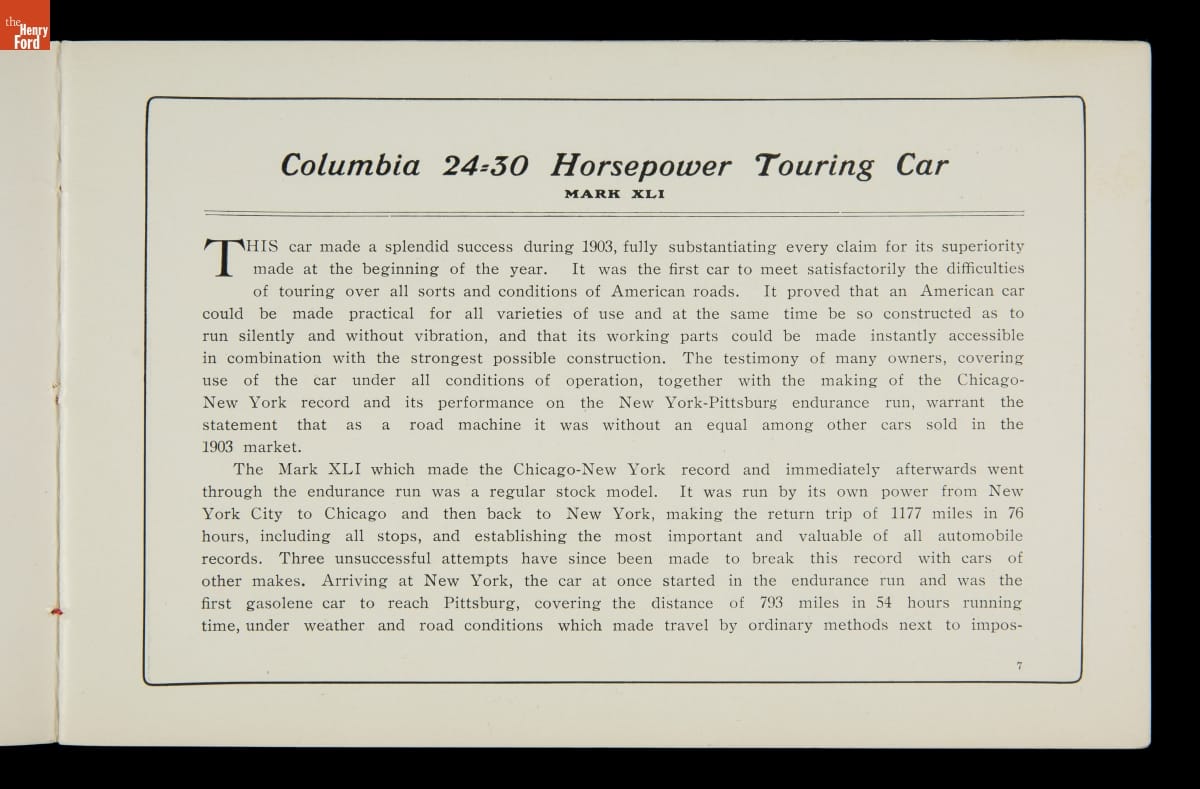 Columbia, built by the Pope Manufacturing Company of Hartford, Connecticut, was America's leading bicycle brand in the late 19th century. Founder Albert A. Pope hoped to duplicate that success with automobiles. Both electric and gasoline Columbia motor vehicles were produced in a range of body styles. But high prices hampered sales, and the last Columbia cars were built in 1913.