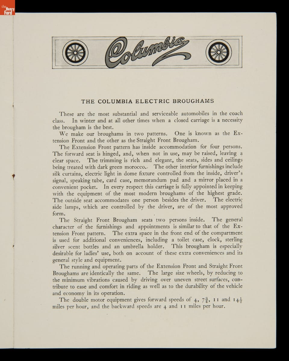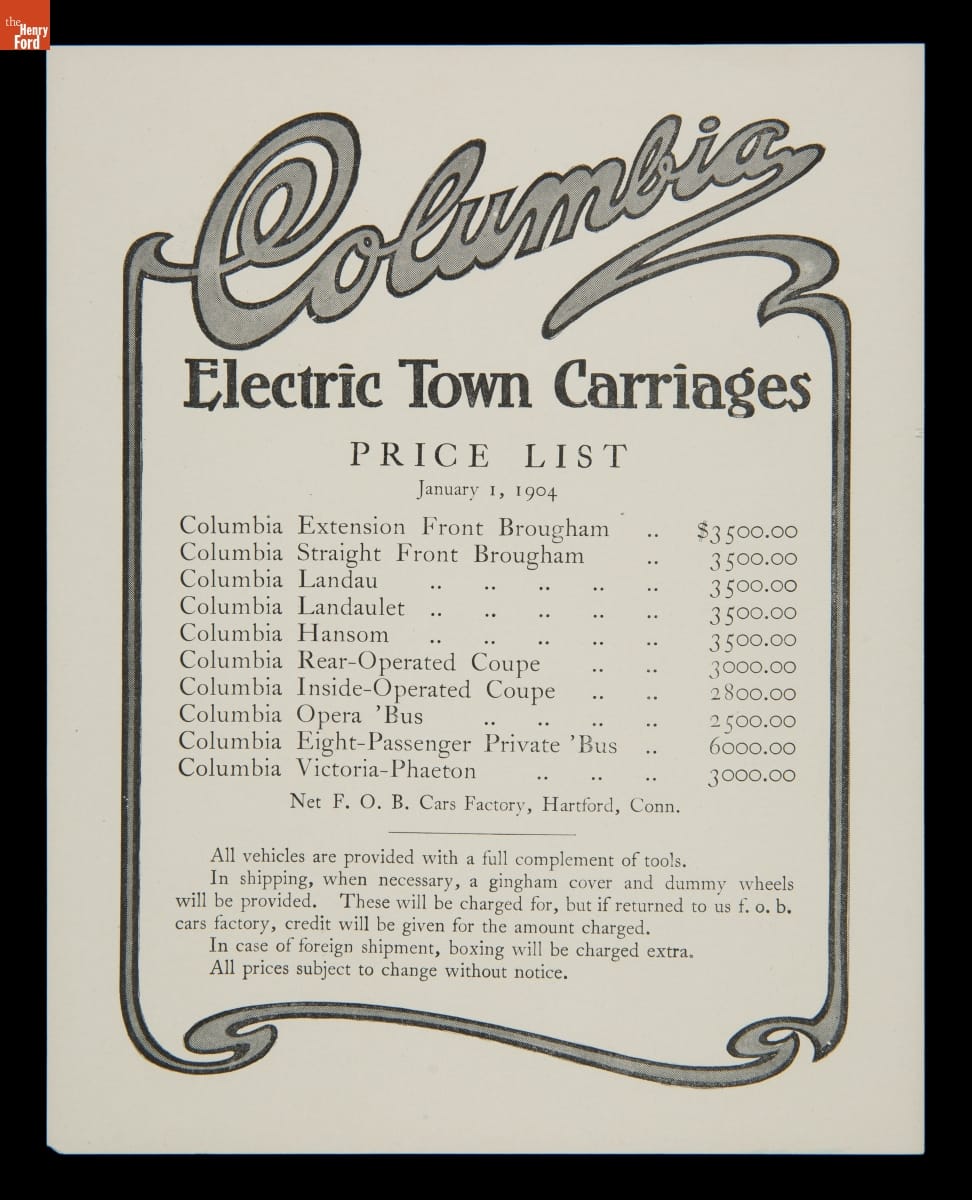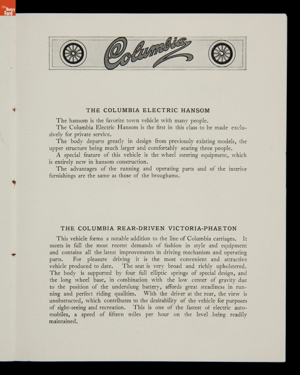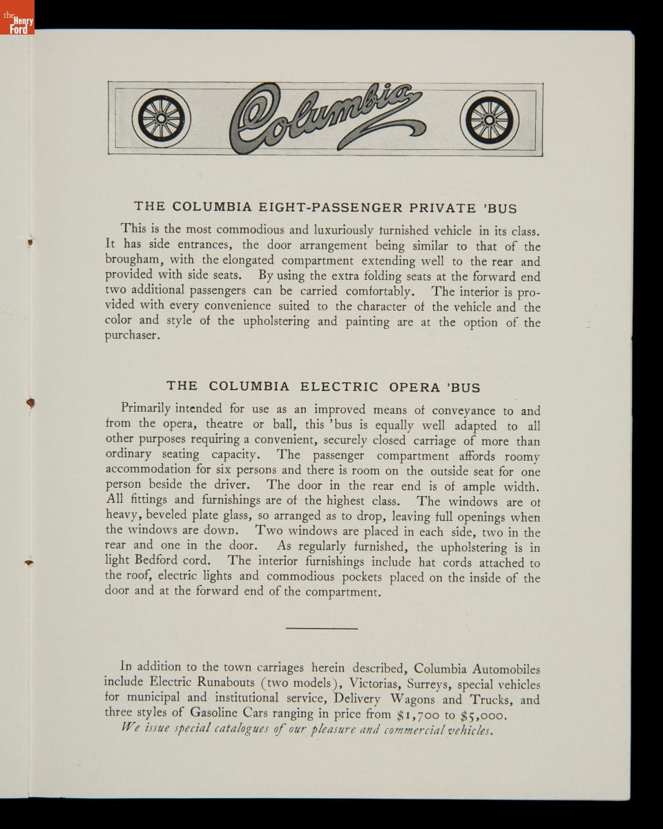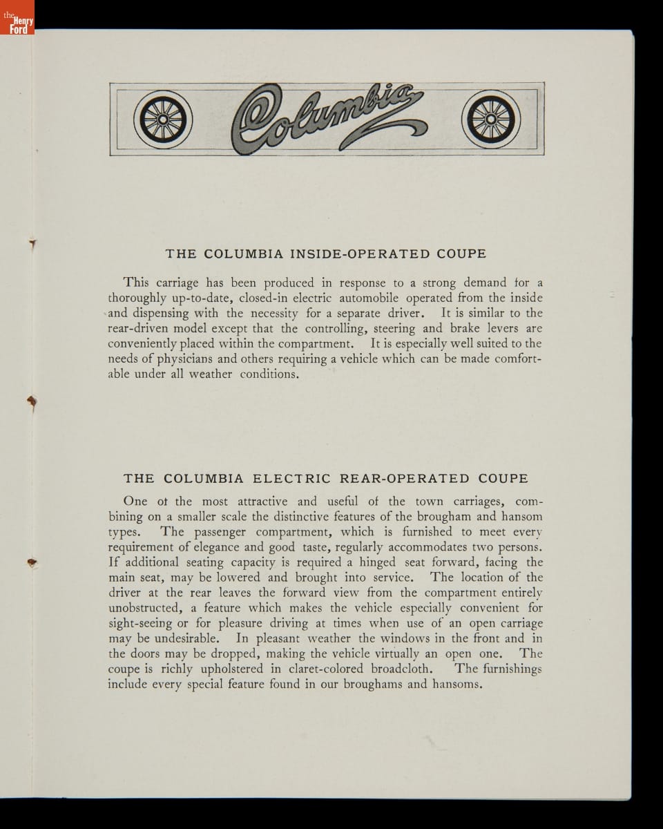 Columbia, built by the Pope Manufacturing Company of Hartford, Connecticut, was America's leading bicycle brand in the late 19th century. Founder Albert A. Pope hoped to duplicate that success with automobiles. Both electric and gasoline Columbia motor vehicles were produced in a range of body styles. But high prices hampered sales, and the last Columbia cars were built in 1913.