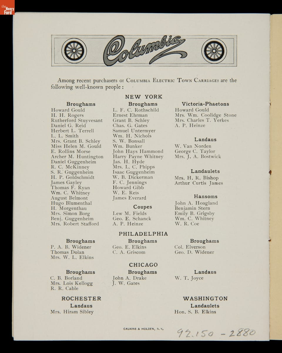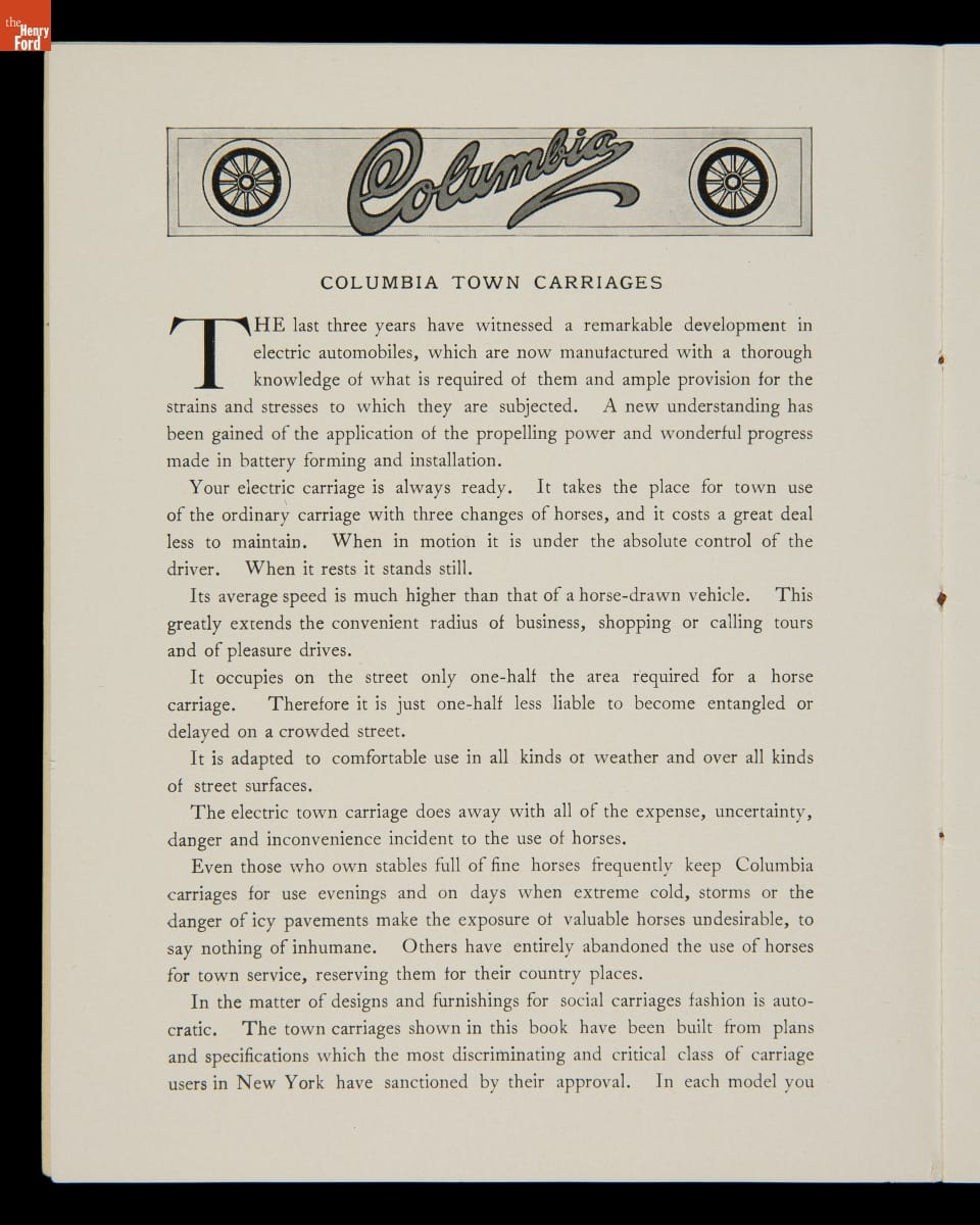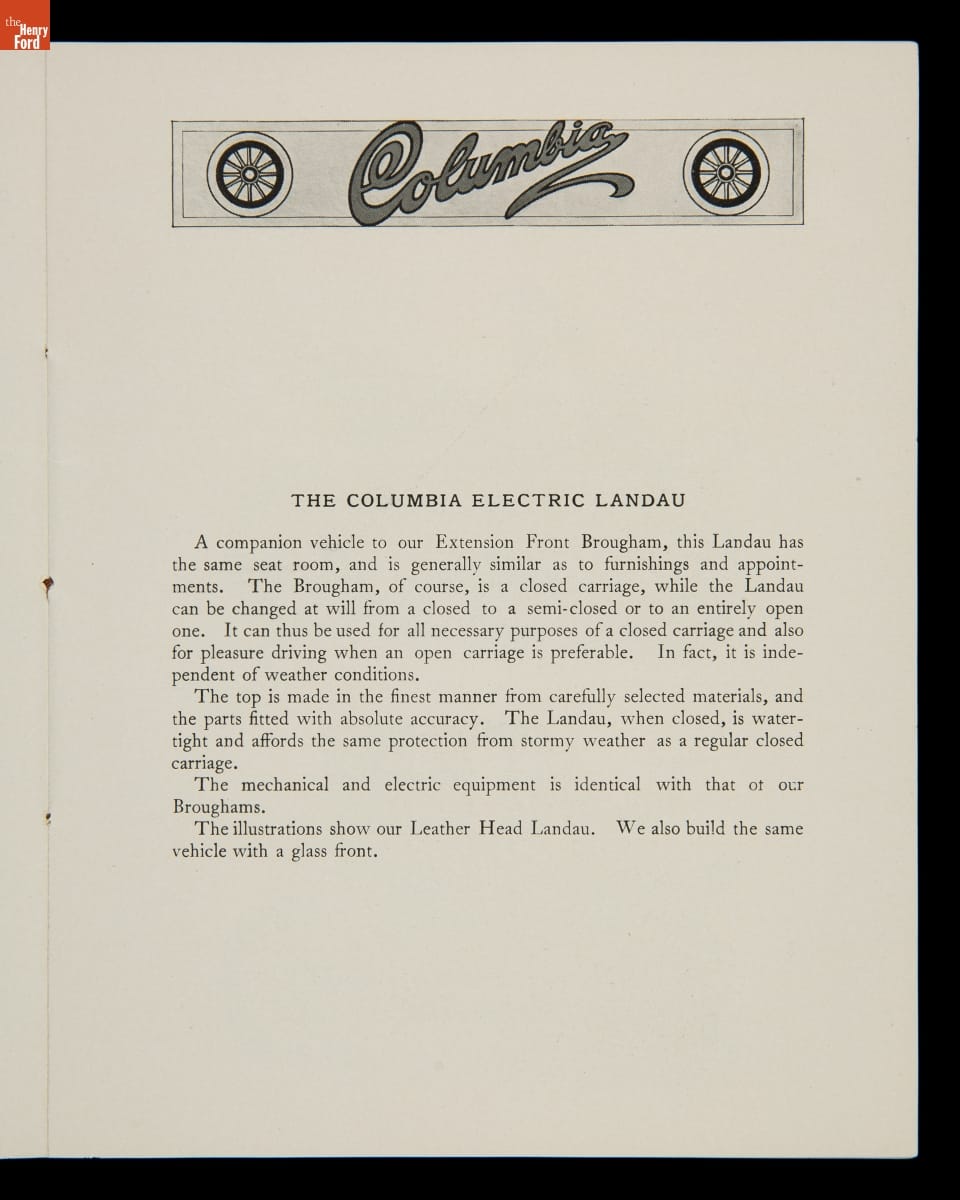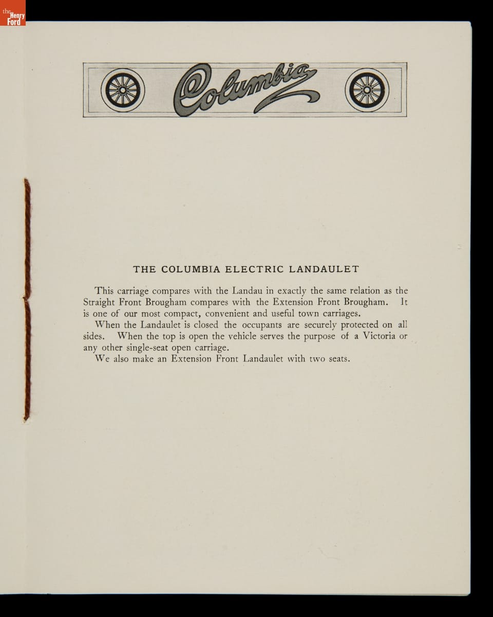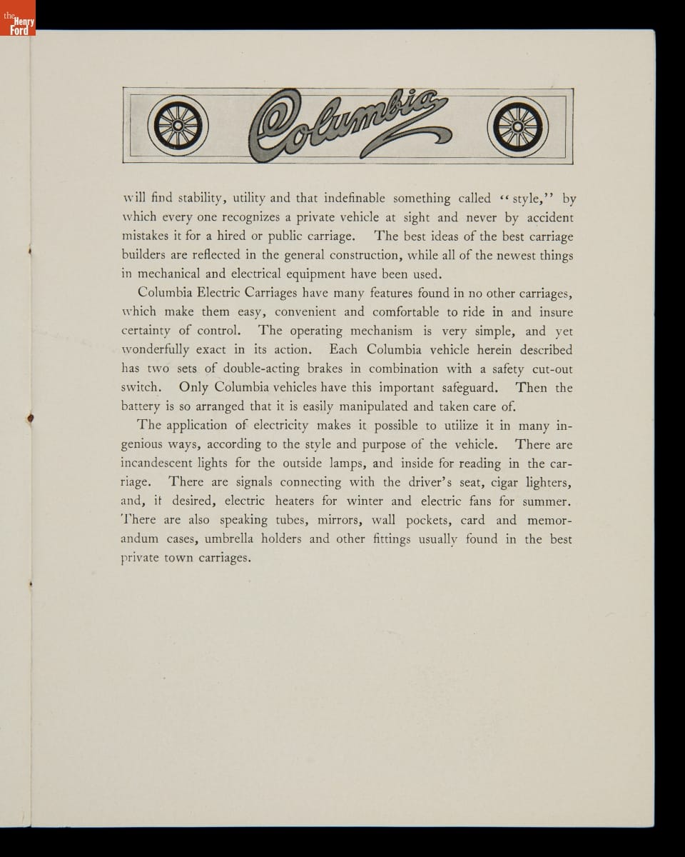 Columbia, built by the Pope Manufacturing Company of Hartford, Connecticut, was America's leading bicycle brand in the late 19th century. Founder Albert A. Pope hoped to duplicate that success with automobiles. Both electric and gasoline Columbia motor vehicles were produced in a range of body styles. But high prices hampered sales, and the last Columbia cars were built in 1913.