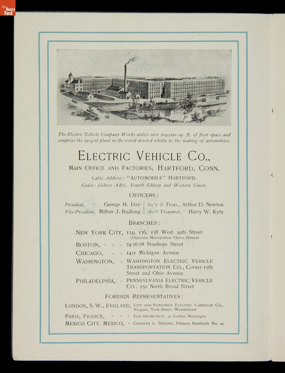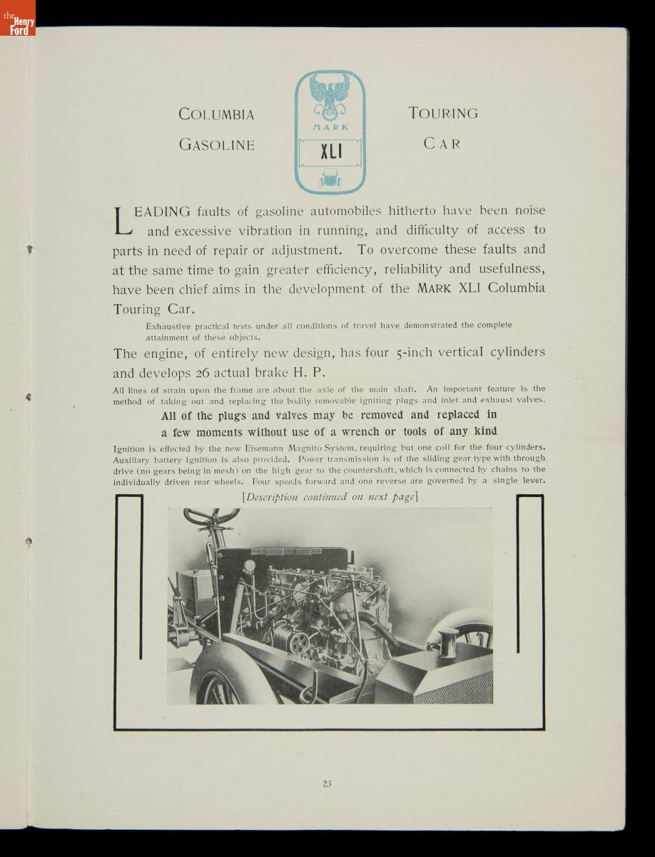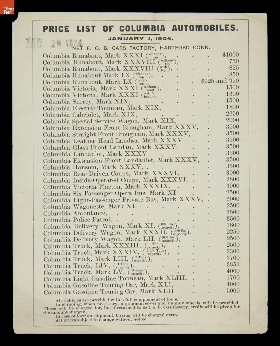 Columbia, built by the Pope Manufacturing Company of Hartford, Connecticut, was America's leading bicycle brand in the late 19th century. Founder Albert A. Pope hoped to duplicate that success with automobiles. Both electric and gasoline Columbia motor vehicles were produced in a range of body styles. But high prices hampered sales, and the last Columbia cars were built in 1913.