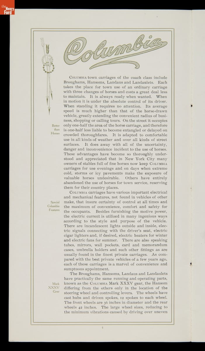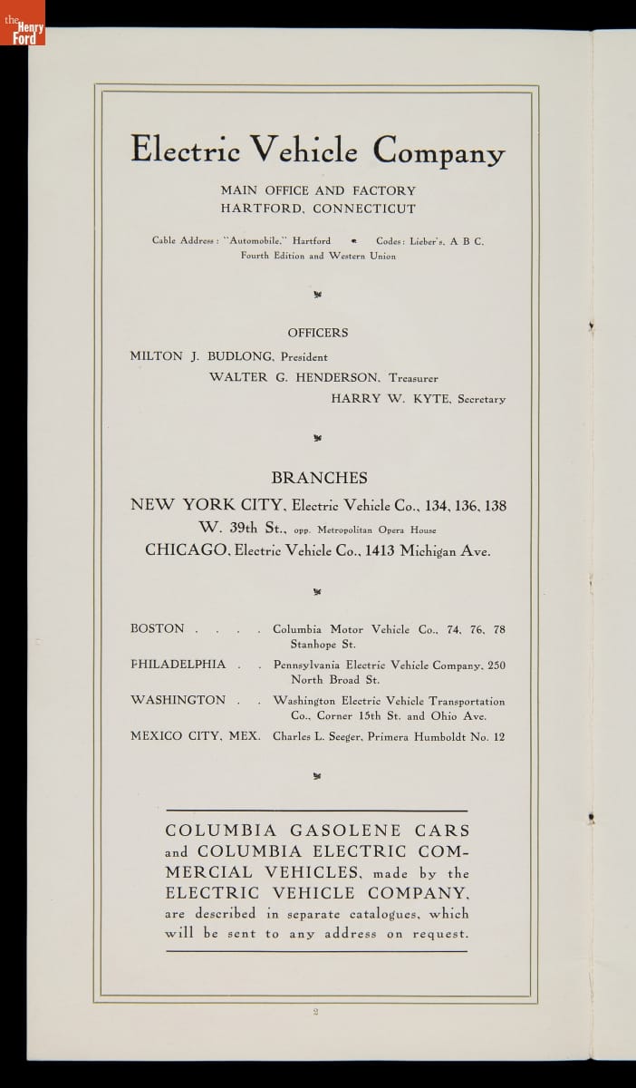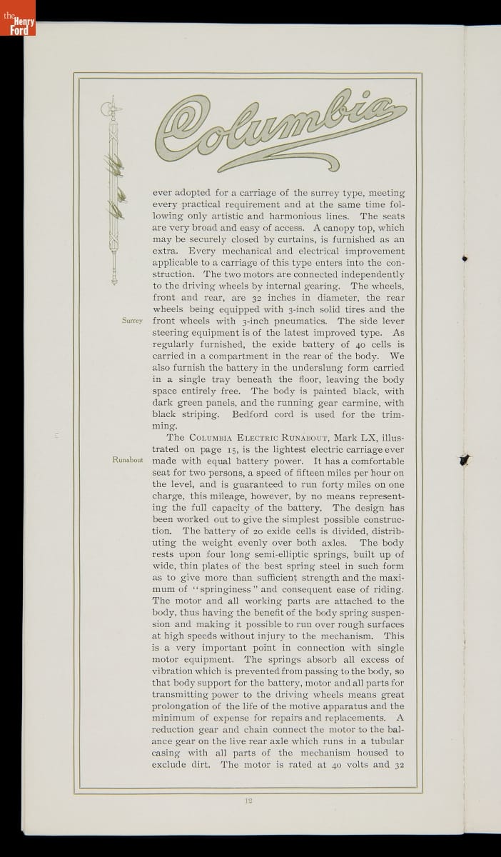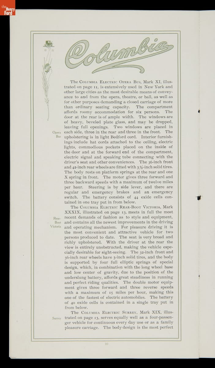 Columbia, built by the Pope Manufacturing Company of Hartford, Connecticut, was America's leading bicycle brand in the late 19th century. Founder Albert A. Pope hoped to duplicate that success with automobiles. Both electric and gasoline Columbia motor vehicles were produced in a range of body styles. But high prices hampered sales, and the last Columbia cars were built in 1913.