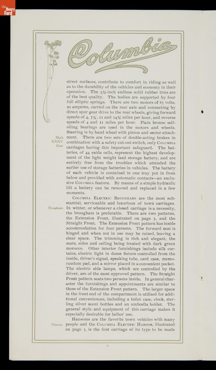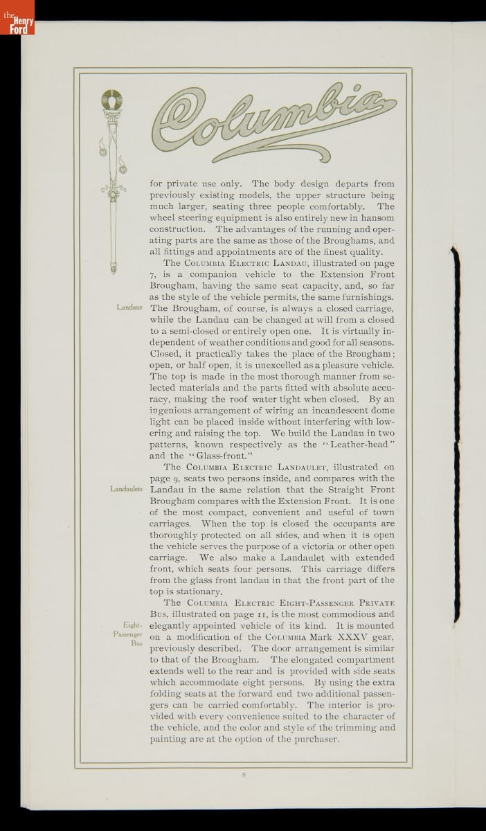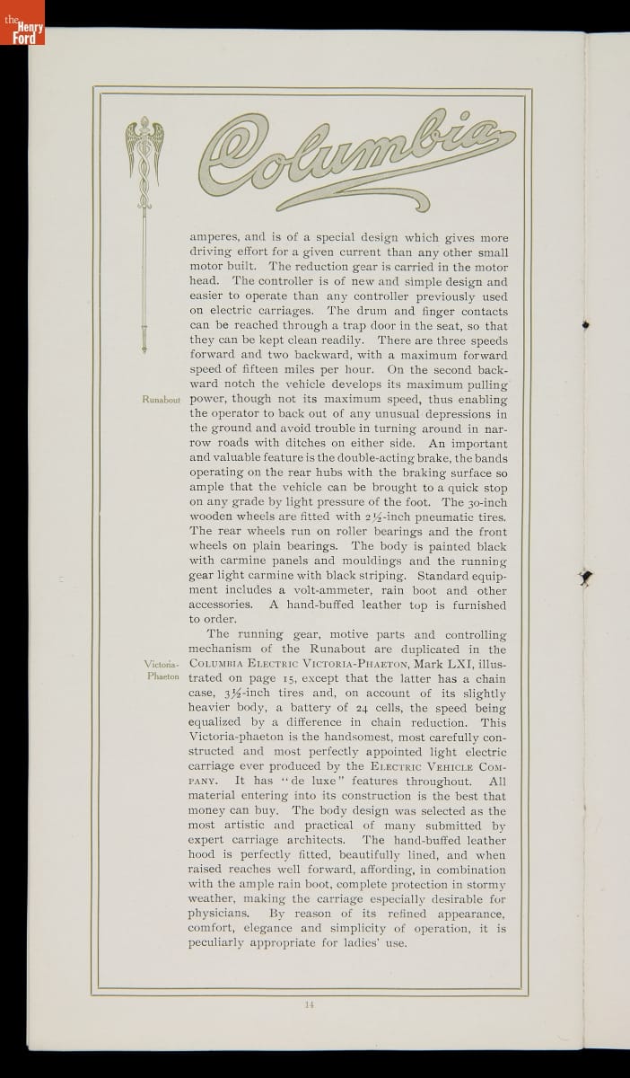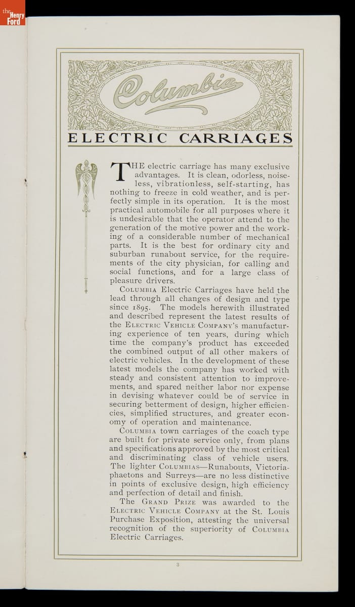 Columbia, built by the Pope Manufacturing Company of Hartford, Connecticut, was America's leading bicycle brand in the late 19th century. Founder Albert A. Pope hoped to duplicate that success with automobiles. Both electric and gasoline Columbia motor vehicles were produced in a range of body styles. But high prices hampered sales, and the last Columbia cars were built in 1913.