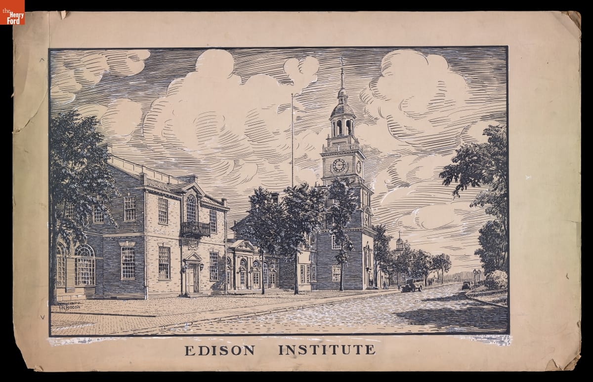 Irving Bacon, a Ford Motor Company employee and Henry Ford's personal artist, created pen-and-ink drawings to illustrate guidebooks for the Edison Institute Museum and Greenfield Village (now The Henry Ford) when they officially opened to the public in 1933. An illustrated souvenir guidebook helped visitors navigate the exhibits and grounds. Ford also used these drawings in other company publications.