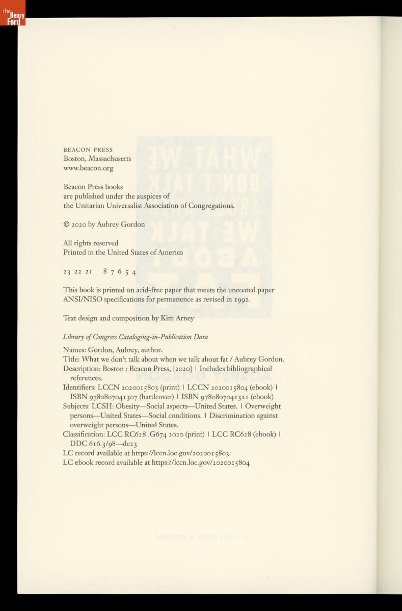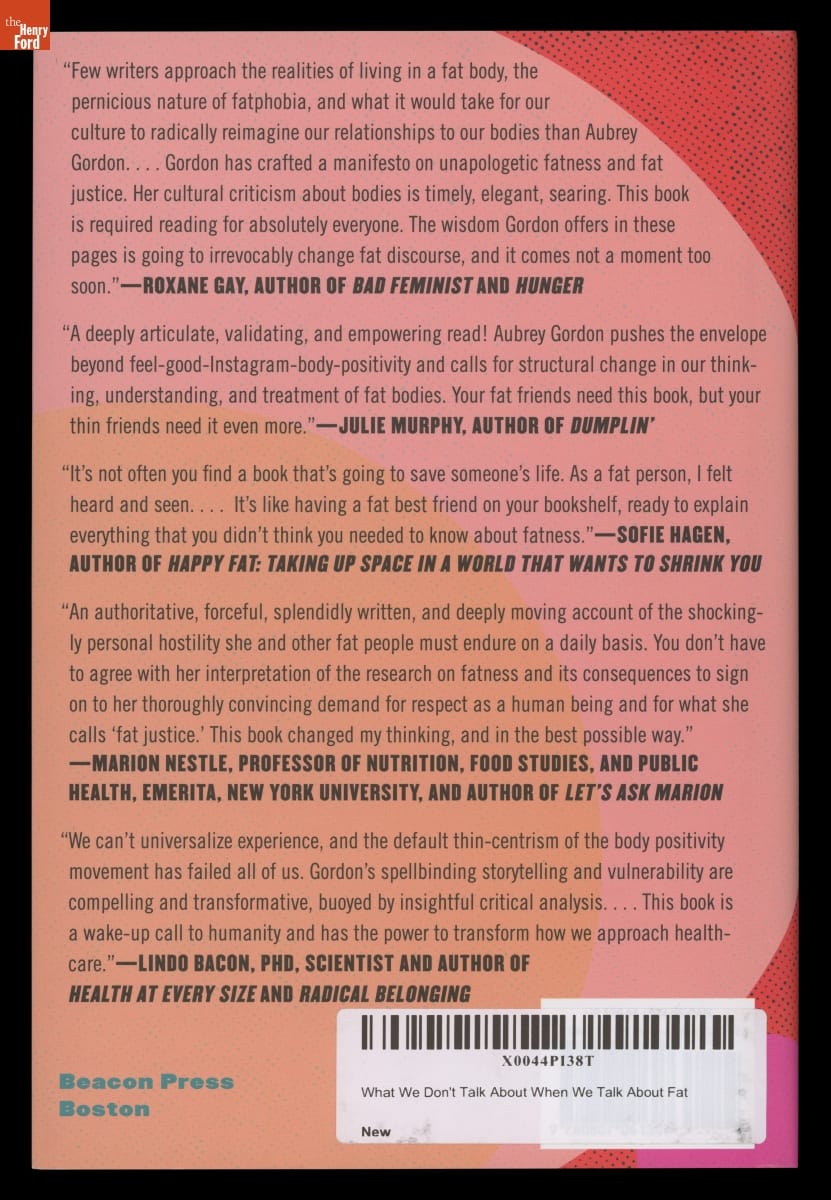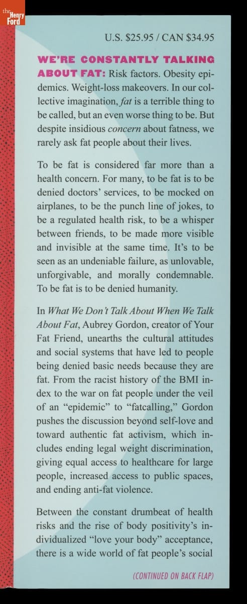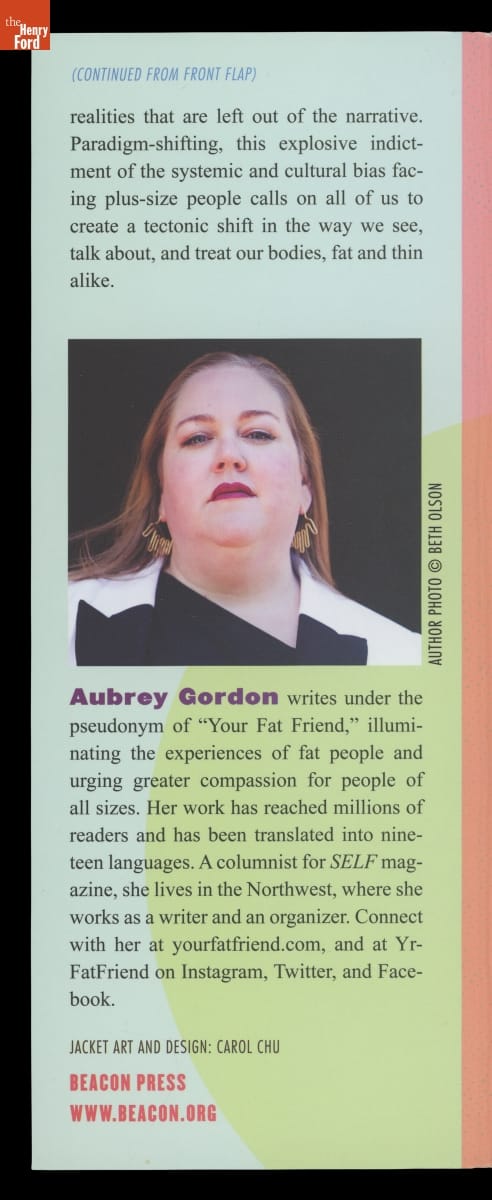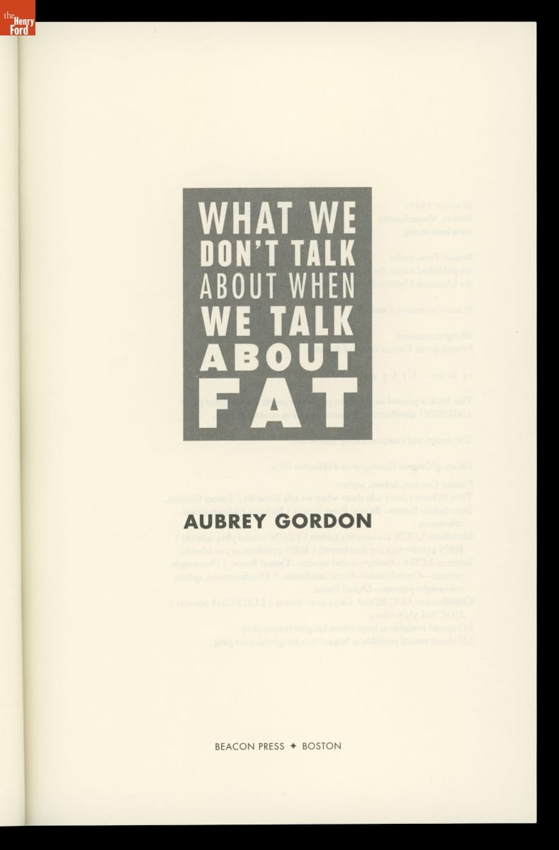 Aubrey Gordon (born 1983), also known as “Your Fat Friend,” is an author, podcaster, and activist, focusing on fatness, fat acceptance, and anti-fat bias. Her first book, What We Don't Talk About When We Talk About Fat, was published in 2020. It analyzes the anti-fat bias (or “fatphobia”) embedded in American culture, and how it affects the lives of fat people.