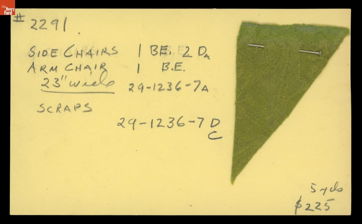 The firm of Ernest LoNano -- active from 1912 into the 1980s -- was known as the premier re-upholsterers of antique American furniture. Museums from coast to coast sought the advice of three generations of LoNanos for accuracy in period upholstery fabrics. The company specialized in adapting historic fabrics for reuse. This card documents fabrics used at The Henry Ford in the 1950s.