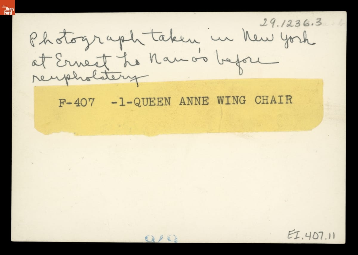The firm of Ernest LoNano -- active from 1912 into the 1980s -- was known as the premier re-upholsterers of antique American furniture. Museums from coast to coast sought the advice of three generations of LoNanos for accuracy in period upholstery fabrics. The company specialized in adapting historic fabrics for reuse. This photograph documents the re-upholstery process on The Henry Ford's furniture by the firm.