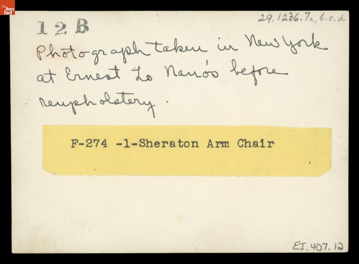 The firm of Ernest LoNano -- active from 1912 into the 1980s -- was known as the premier re-upholsterers of antique American furniture. Museums from coast to coast sought the advice of three generations of LoNanos for accuracy in period upholstery fabrics. The company specialized in adapting historic fabrics for reuse. This photograph documents the re-upholstery process on The Henry Ford's furniture by the firm.