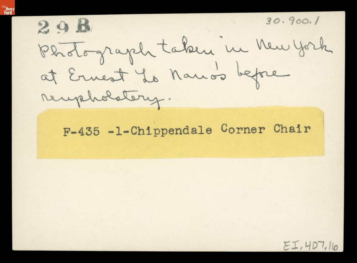 The firm of Ernest LoNano -- active from 1912 into the 1980s -- was known as the premier re-upholsterers of antique American furniture. Museums from coast to coast sought the advice of three generations of LoNanos for accuracy in period upholstery fabrics. The company specialized in adapting historic fabrics for reuse. This photograph documents the re-upholstery process on The Henry Ford's furniture by the firm.