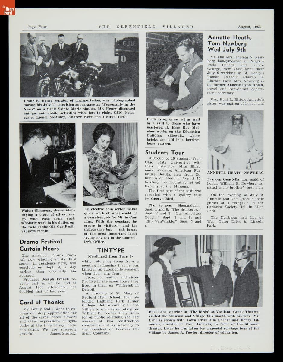 The Greenfield Villager was a regular publication of the Edison Institute created for its employees. First published in 1951, the newspaper kept employees abreast of institutional special events and acquisitions and provided information about employee recreational and educational opportunities, work benefits, and personal milestones. The last issue of The Greenfield Villager came out in 1981.
