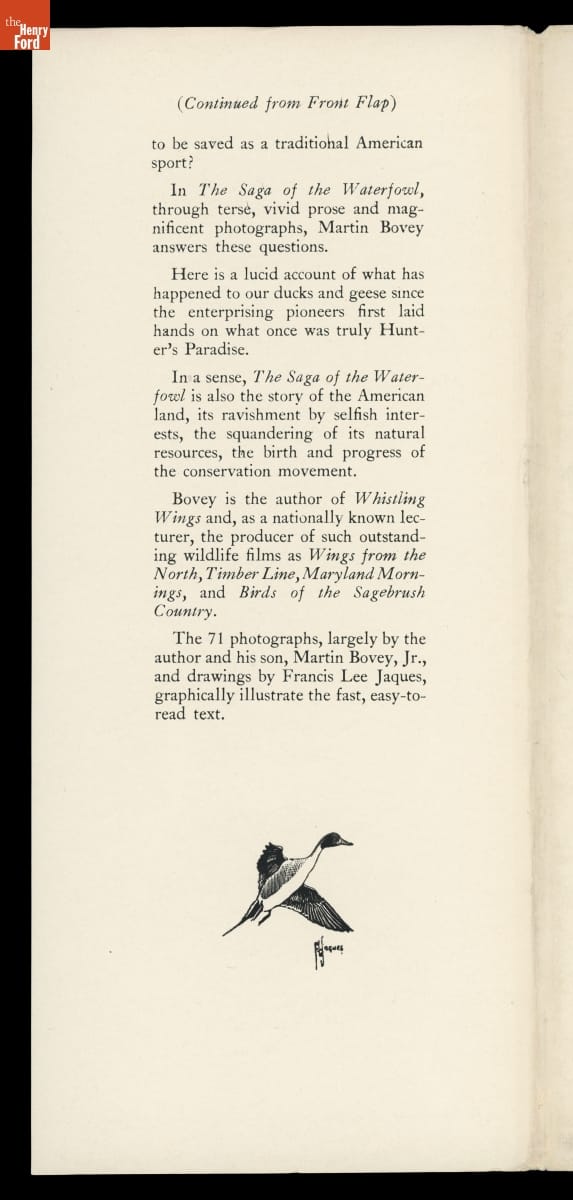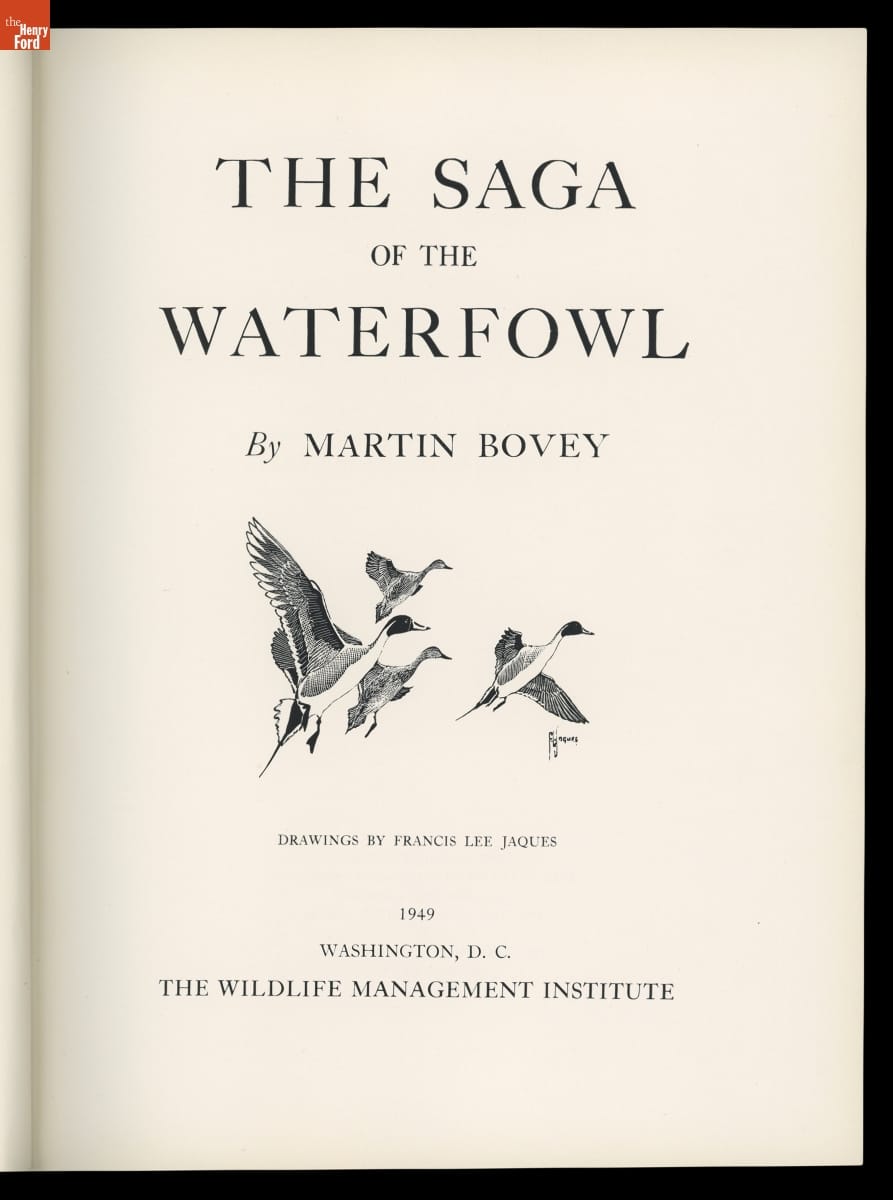 Martin Bovey's (1899-1980) life-long passion for North American wildlife led him to a career as a nature photographer, documentary filmmaker, lecturer, and author. In The Saga of the Waterfowl, Bovey explores the need for water bird conservation. His son and business partner, Martin Jr., contributed photographs to this book, and Frances Lee Jaques, noted wildlife painter, created supplementary illustrations.