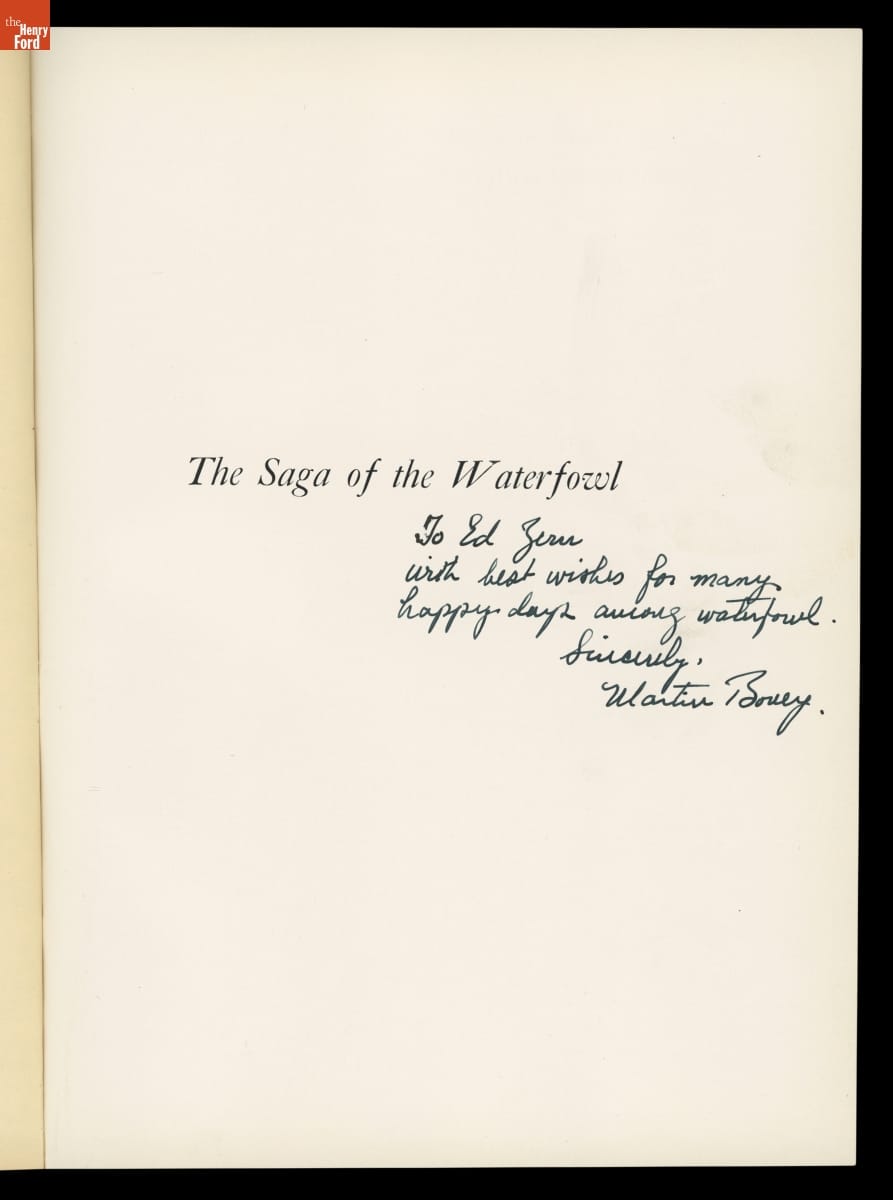 To Ed Zern / with best wishes for many / happy days among waterfowl. / Sincerely, / Martin Bovey.