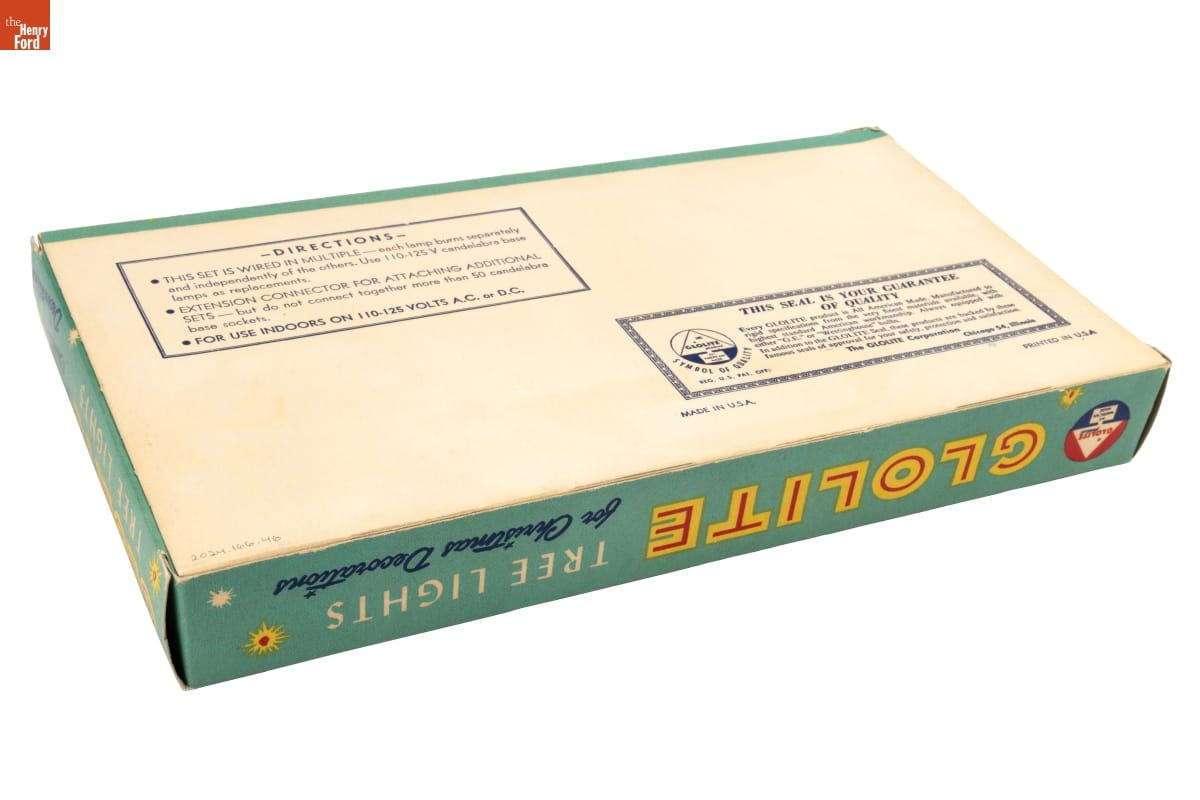 -DIRECTIONS- / -THIS SET IS WIRED IN MULTIPLE - each lamp burns separately / and independently of the others. Use 110-125 V candelabra base / lamps as replacements. / -EXTENSION CONNECTOR FOR ATTACHING ADDITIONAL / SETS - but do not connect together more than 50 candelabra / base sockets. / -FOR INDOORS ON 110-125 VOLTS A.C. or D.C. / a / GLOLITE / product / ALL / AMERICAN / MADE / SYMBOL OF QUALITY / REG. U.S. PAT. OFF. / THIS SEAL IS YOUR GUARANTEE OF QUALITY / [...] / The GLOLITE Corporation / Chicago 54, Illinois / MADE IN U.S.A. / PRINTED IN U.S.A.