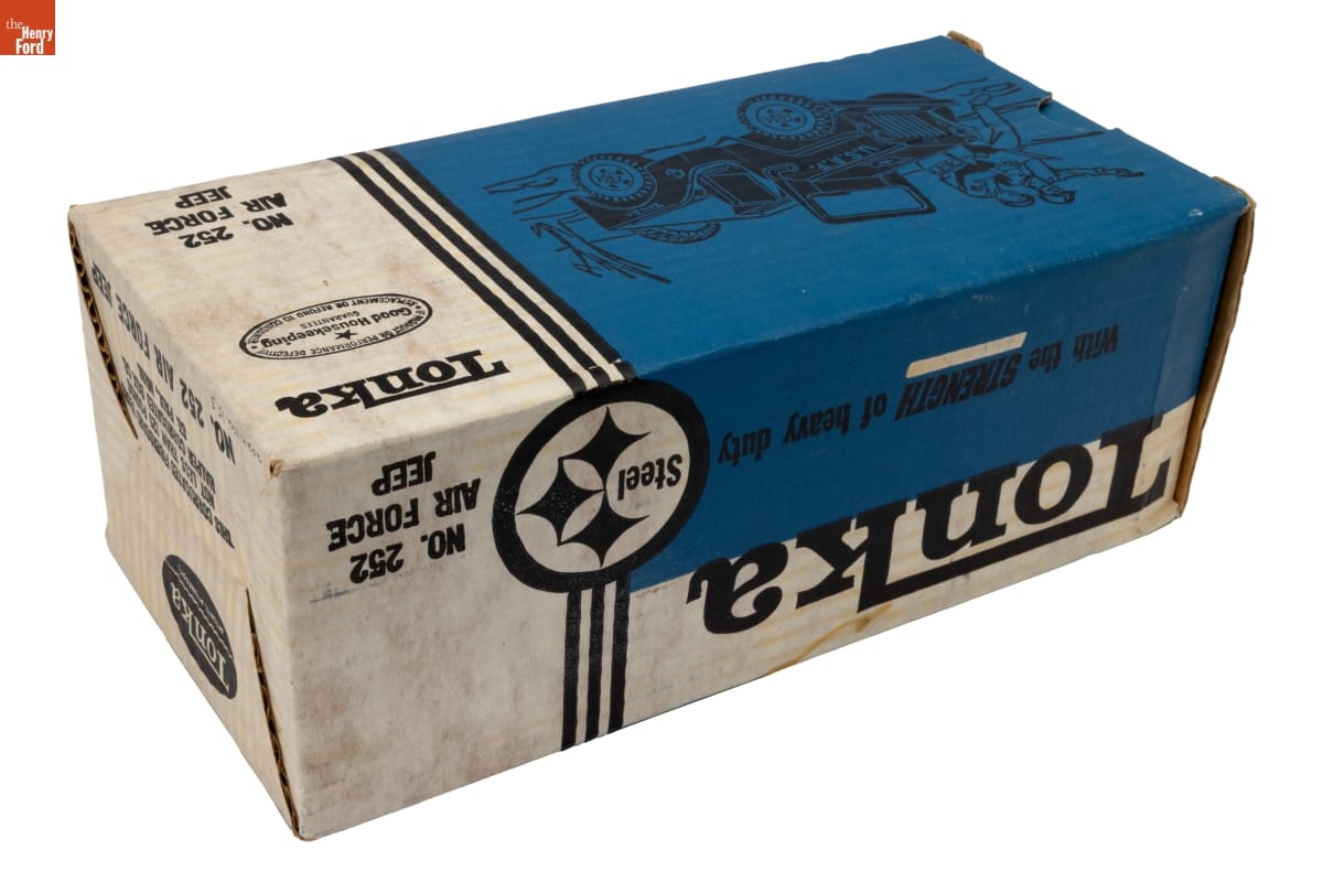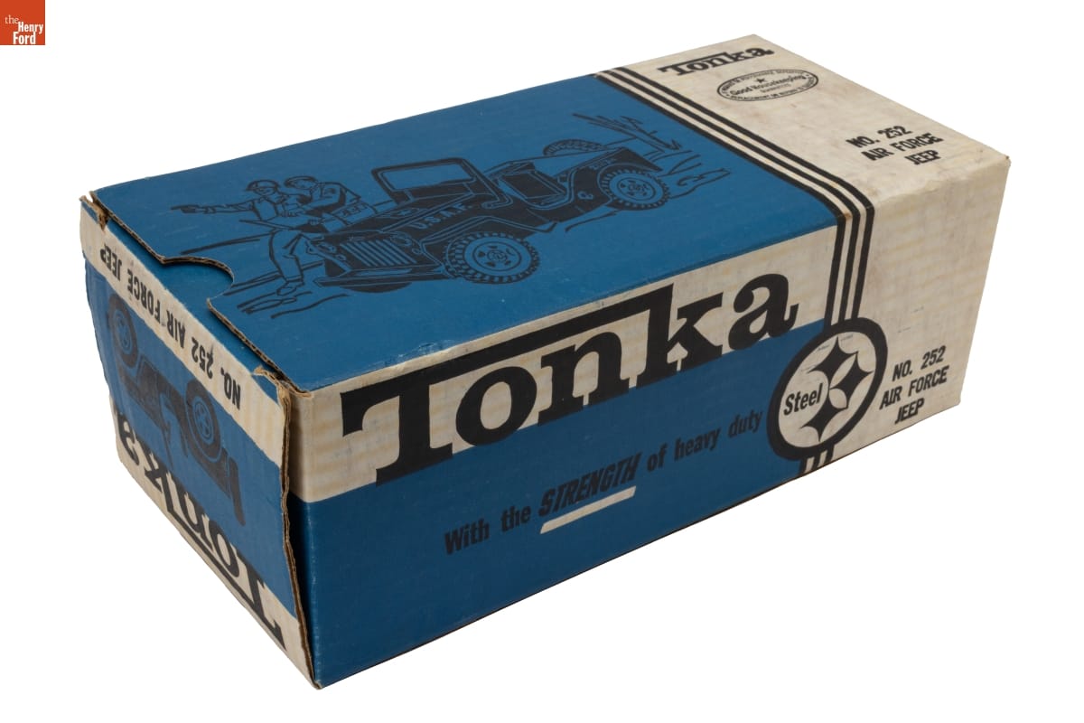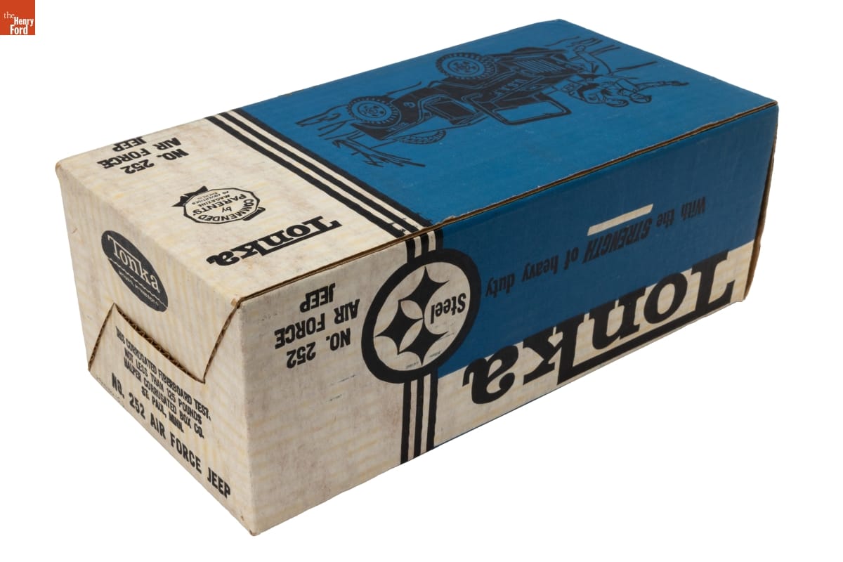 Tonka / MOUND, MINNESOTA / THIS CORRUGATED FIBERBOARD TESTS / NOT LESS THAN 125 POUNDS / HALPER CORRUGATED BOX CO. / ST. PAUL, MINN. / NO. 252 AIR FORCE JEEP