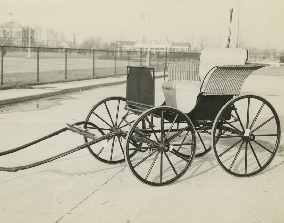 Mary Kellogg Hopkins of San Francisco, California, whose husband made his fortune in the railroad industry, used this Ladies' Phaeton, sometimes called a Basket Phaeton or Morning Phaeton. These light, fashionable vehicles, driven almost exclusively by women, were popular at resorts, parks or beaches. The ample foot bay allowed women to display their sweeping skirts.