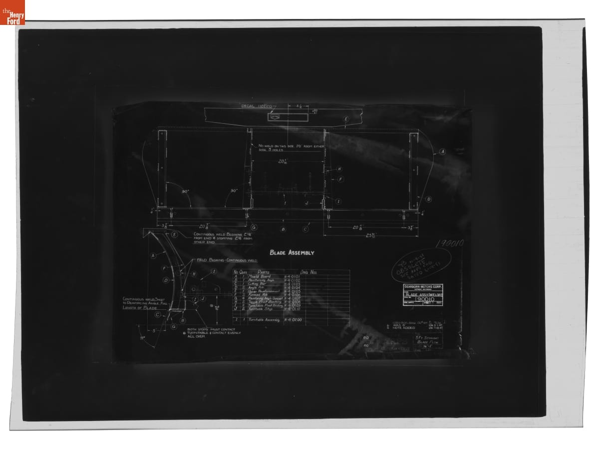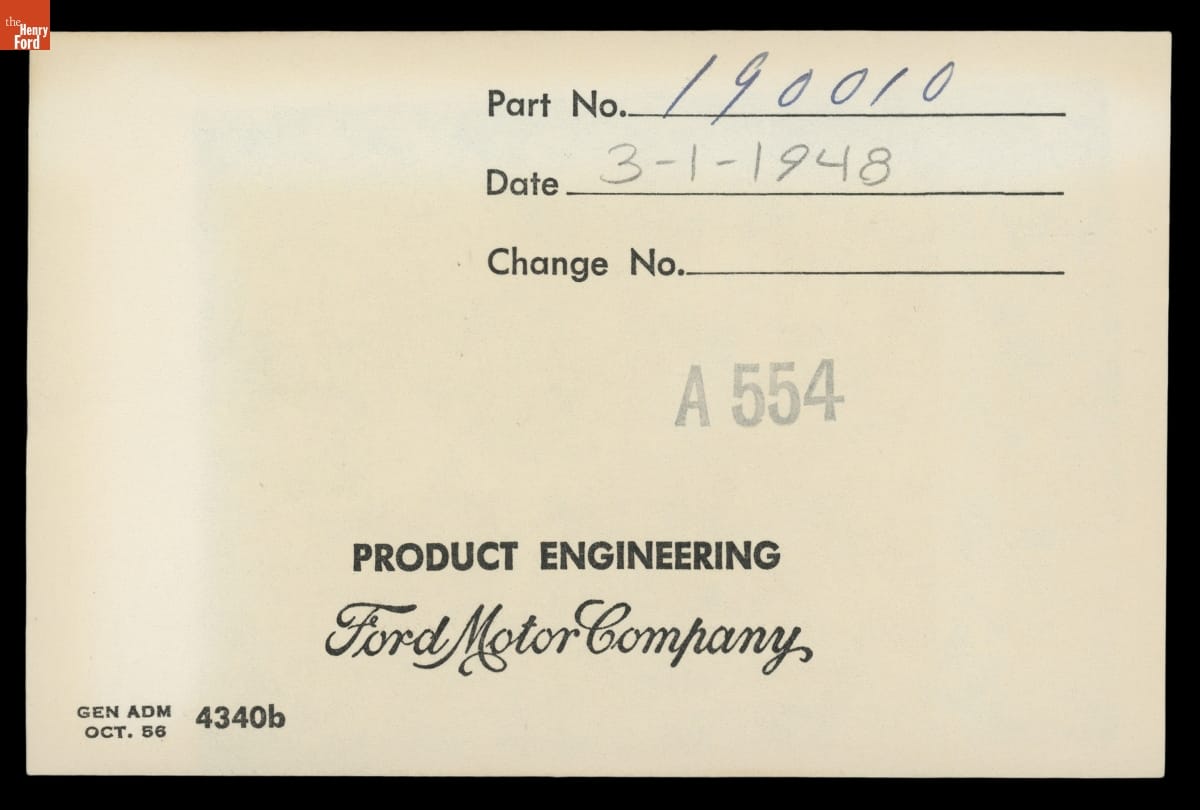 The Ford Motor Company created over a million parts drawings from 1903 to 1957. Many of these drawings specify engineering requirements for the components of Ford-made vehicles--including automobiles, trucks, tractors, military vehicles and Tri-motor airplanes. Others document assembly components, stages of casting and forging, or experimental designs. Beginning in the 1940s, Ford transferred the drawings to microfilm.