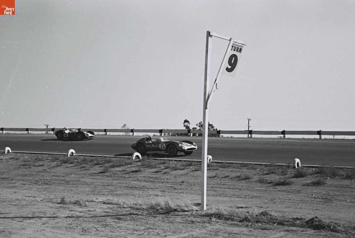 Photographer Dave Friedman preserved auto racing history through his work and his collection of works by others. These images document key races, cars, drivers, and teams. This photo is from the 1960 Grand Prix for Sports Cars at Riverside International Raceway, about 50 miles east of Los Angeles. Bill Krause won the 200-mile main event in a Maserati Tipo 61.
