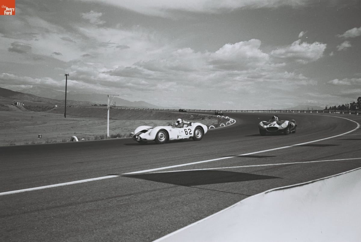 Photographer Dave Friedman preserved auto racing history through his work and his collection of works by others. These images document key races, cars, drivers, and teams. This photo is from the 1960 Grand Prix for Sports Cars at Riverside International Raceway, about 50 miles east of Los Angeles. Bill Krause won the 200-mile main event in a Maserati Tipo 61.