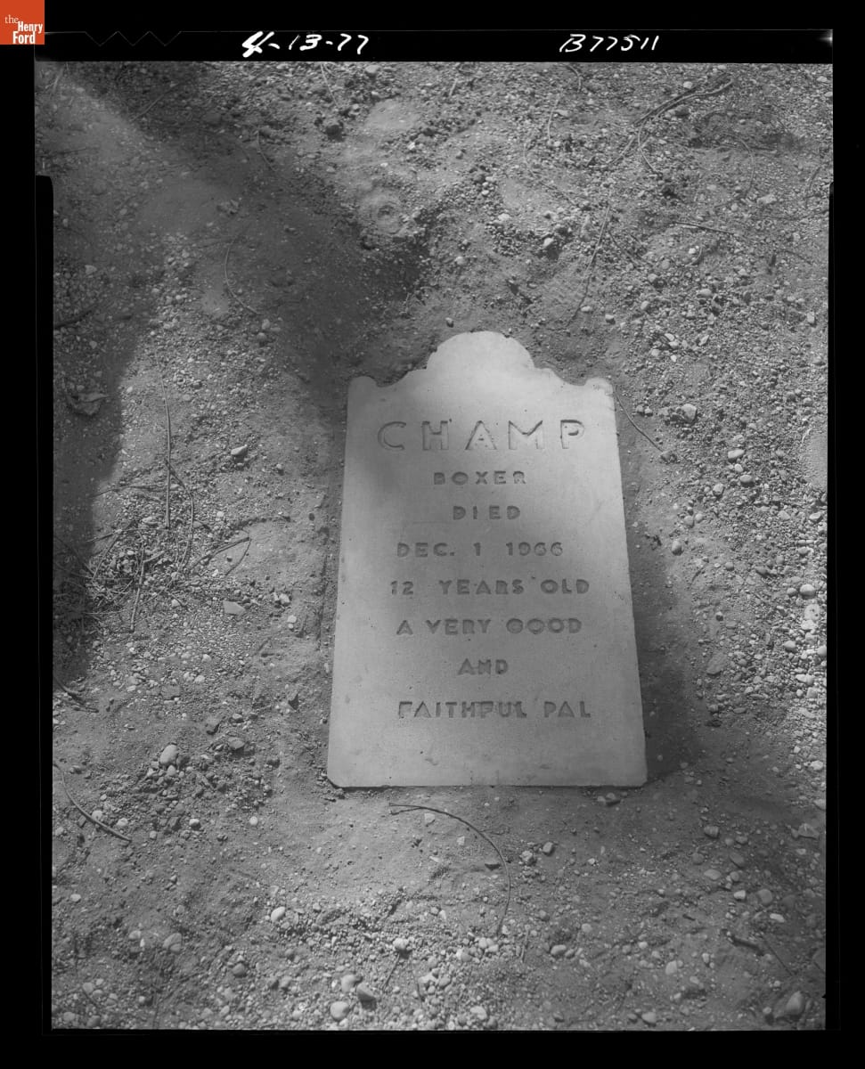Dogs have served in many capacities at Greenfield Village over the years. A boxer named Champ lived in the Village Grounds Office during the 1950s and 60s. Champ often joined visitors on tours of the grounds. Champ became a favorite of the Village staff and is remembered as a "very good and faithful pal." He is buried behind Cotswold Cottage.
