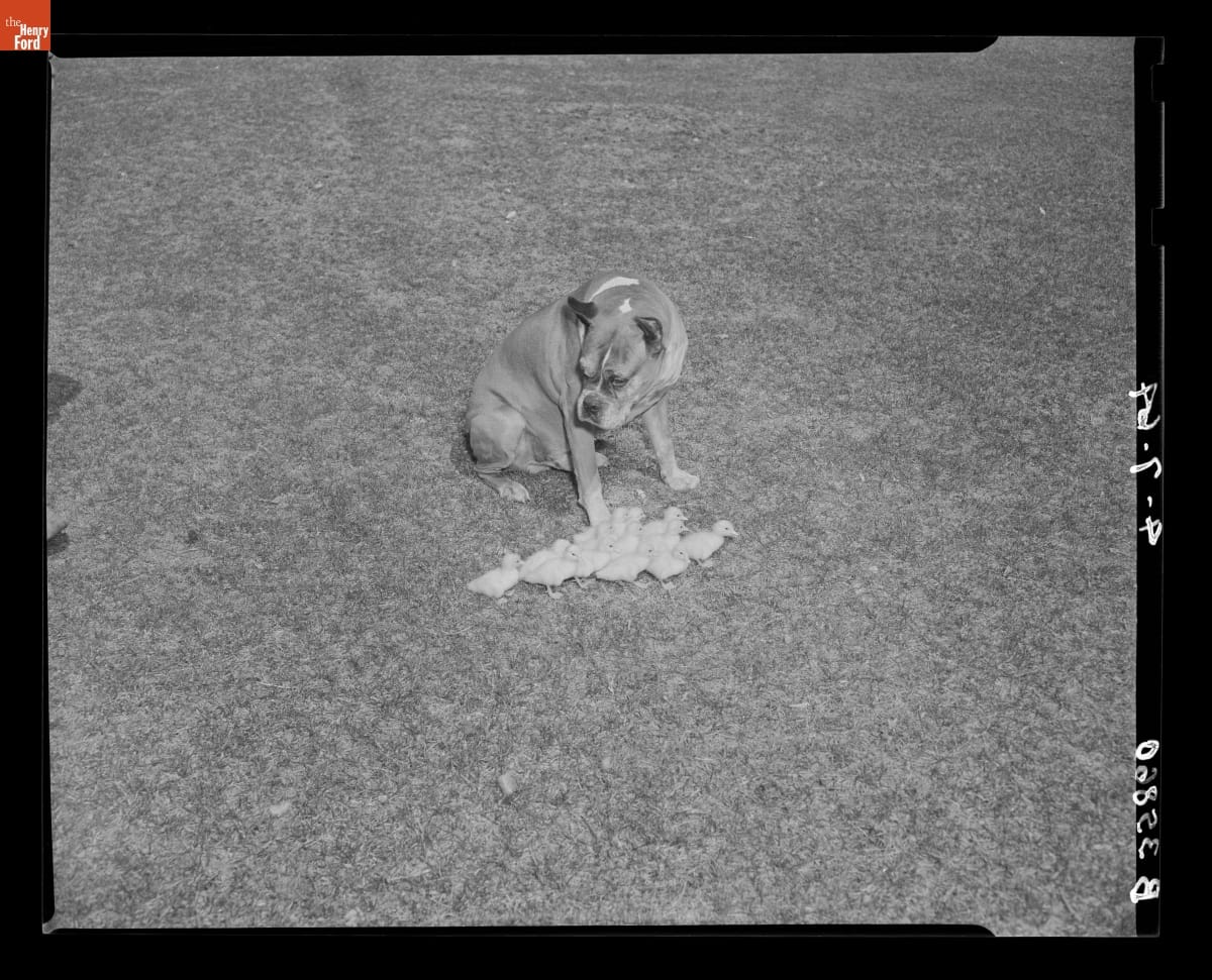 Champ the Dog with Newborn Ducks in Greenfield Village, April 6, 1964