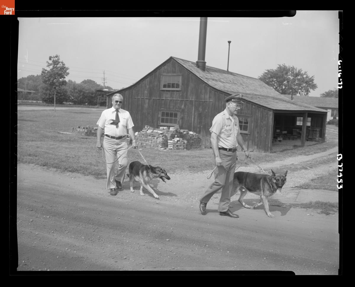 Dogs have served in many capacities at Greenfield Village over the years. German Shepherds, King and Queen, and their human handlers patrolled the grounds of Greenfield Village in the late 1970s. Security officers at the Village employed the Shepherds to improve safety -- the brother and sister pair were not attack dogs but alerted their handlers to the presence of intruders.