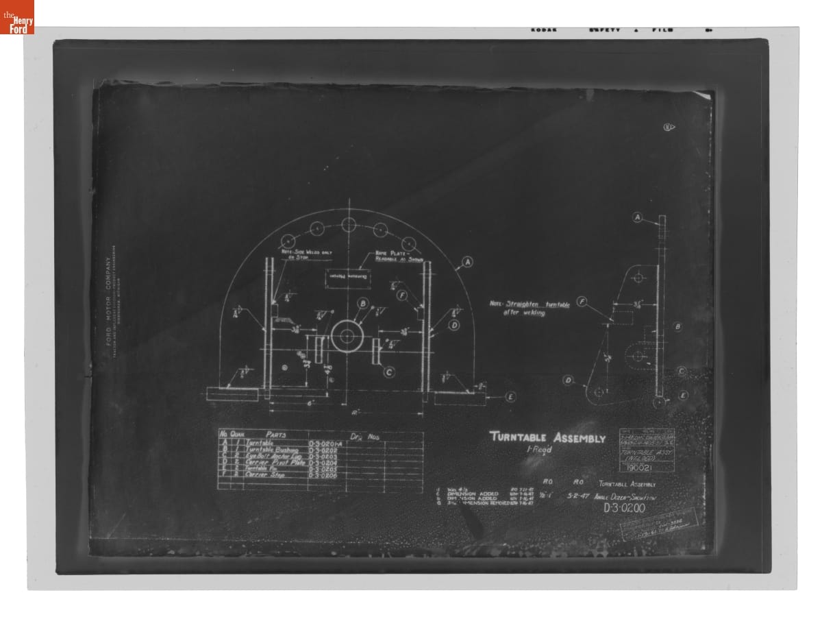 The Ford Motor Company created over a million parts drawings from 1903 to 1957. Many of these drawings specify engineering requirements for the components of Ford-made vehicles--including automobiles, trucks, tractors, military vehicles and Tri-motor airplanes. Others document assembly components, stages of casting and forging, or experimental designs. Beginning in the 1940s, Ford transferred the drawings to microfilm.