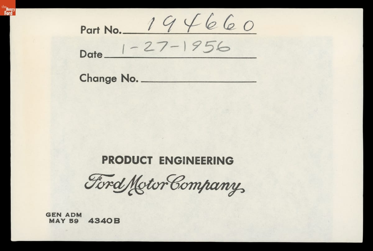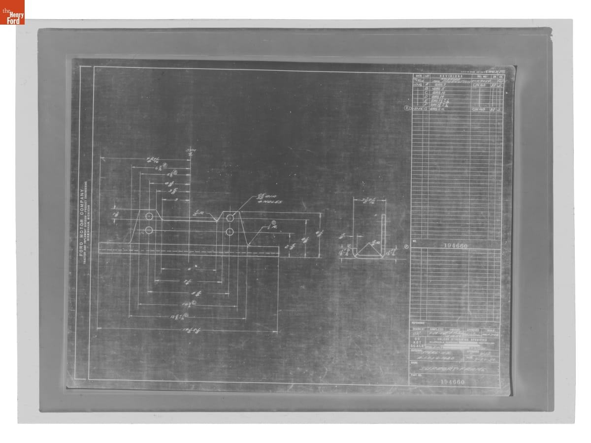 The Ford Motor Company created over a million parts drawings from 1903 to 1957. Many of these drawings specify engineering requirements for the components of Ford-made vehicles--including automobiles, trucks, tractors, military vehicles and Tri-motor airplanes. Others document assembly components, stages of casting and forging, or experimental designs. Beginning in the 1940s, Ford transferred the drawings to microfilm.