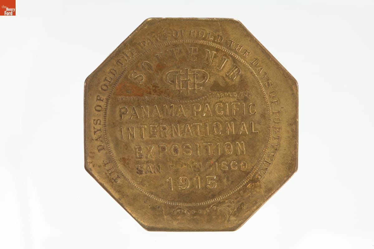 The Panama-Pacific International Exposition celebrated the 1914 completion of the Panama Canal and the 400th anniversary of the discovery of the Pacific Ocean. Nearly nineteen million people visited San Francisco, recently recovered from a devastating 1906 earthquake, during the fair in 1915. Many returned home with mementos, such as this souvenir token honoring the California Gold Rush of 1849.