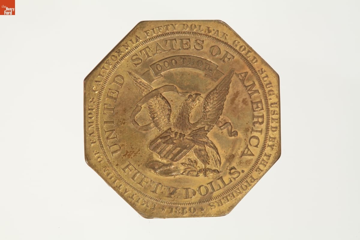 side 2: IMITATION OF FAMOUS CALIFORNIA FIFTY DOLLAR GOLD SLUG, USED BY PIONEERS / 1850 / UNITED STATES OF AMERICA / FIFTY DOLLS.