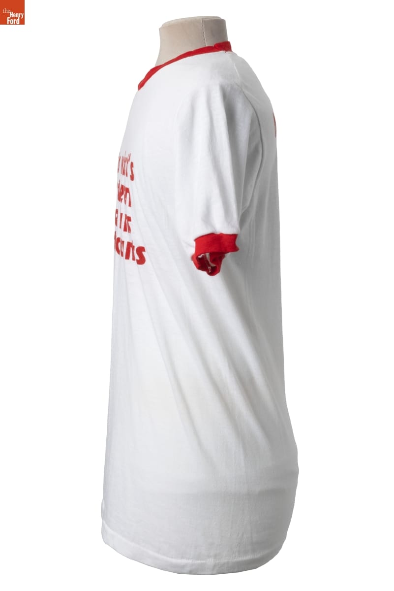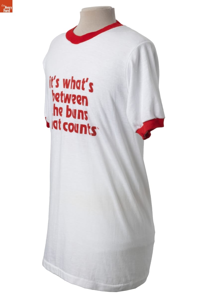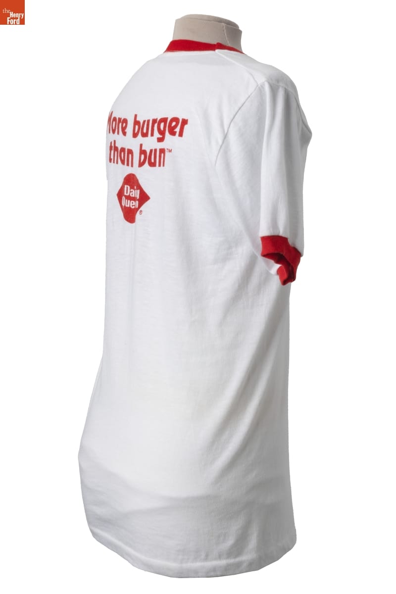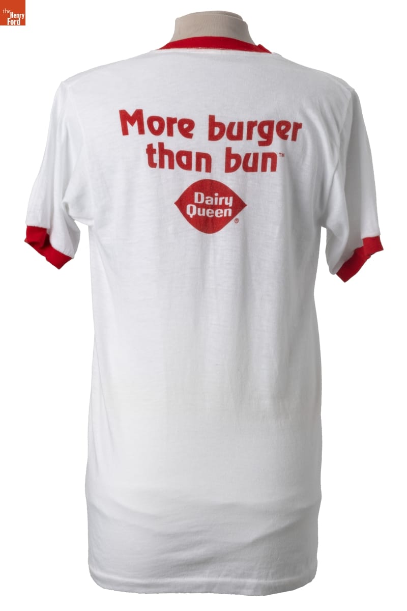 Dairy Queen opened its first store in 1940, specializing in frozen dairy products. The fast-food franchise expanded its menu in the late 1950s, offering hamburgers and other hot foods. In 1979, Dairy Queen trademarked the slogan "More Burger than Bun," which touted the size of its burgers compared to the bun. The company produced branded t-shirts like this for its employees to wear.