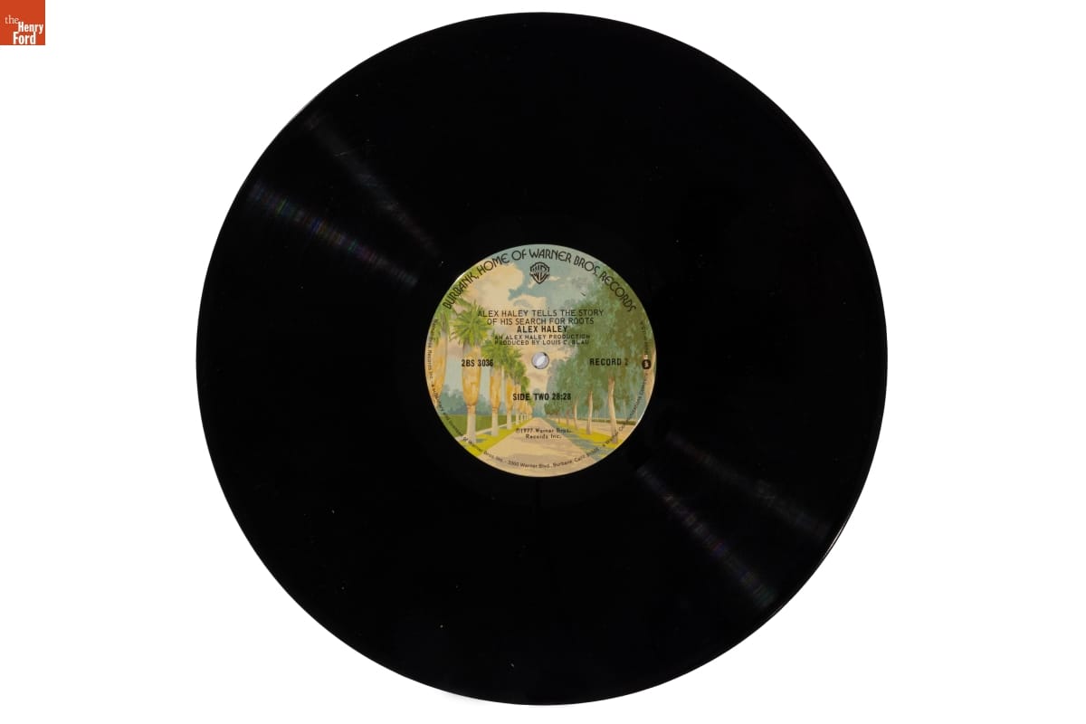 BURBANK, HOME OF WARNER BROS. RECORDS / WB / ALEX HALEY TELLS THE STORY / OF HIS SEARCH FOR ROOTS / ALEX HALEY / AN ALEX HALEY PRODUCTION / PRODUCED BY LOUIS C. BLAU / 2BS 3036 RECORD 2 / SIDE TWO 28:28 / (R)1977 Warner Bros. / Records Inc. / [...]