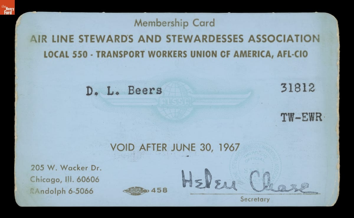 Diane Beers joined TWA as a flight attendant in 1965. She carried this card confirming her membership in the occupational union. Beers left TWA to marry Richard Hill in 1966. At the time, many airlines would not employ married women as flight attendants. That practice was eliminated on U.S.-based carriers by the 1980s.