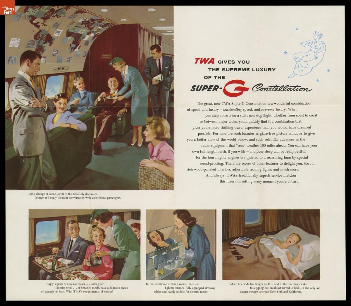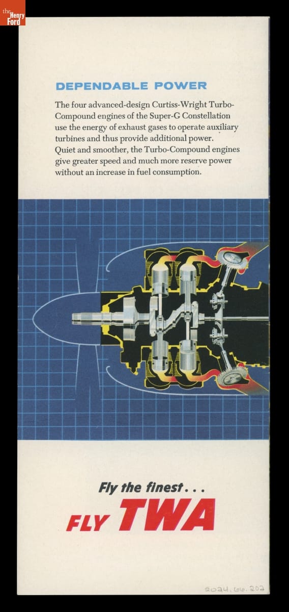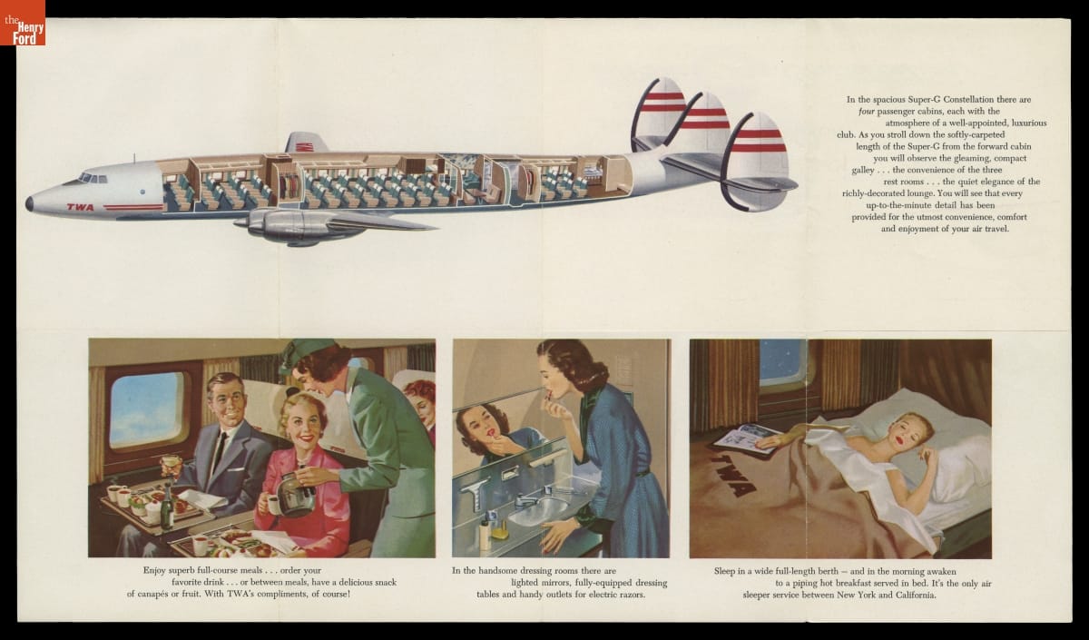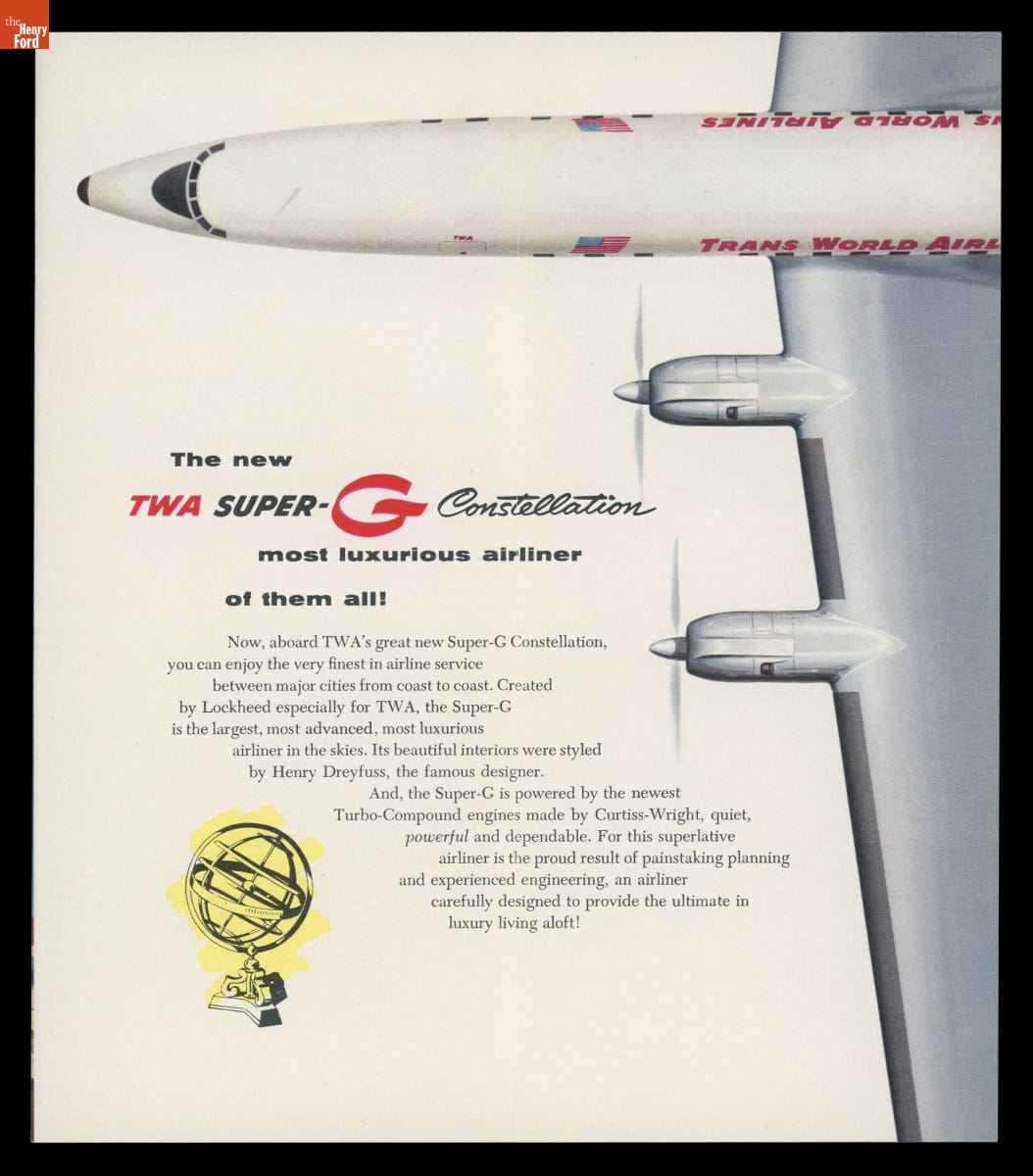 TWA announced the arrival of new Lockheed Super-G Constellation aircraft in this brochure. Introduced in military form during World War II, the civilian Constellation provided fast, comfortable service on transcontinental and transatlantic flights, with a cruising speed of 340 mph. Eastern Air Lines, Northwest Airlines, Pan Am, and several international carriers also operated Constellations as part of their fleets.
