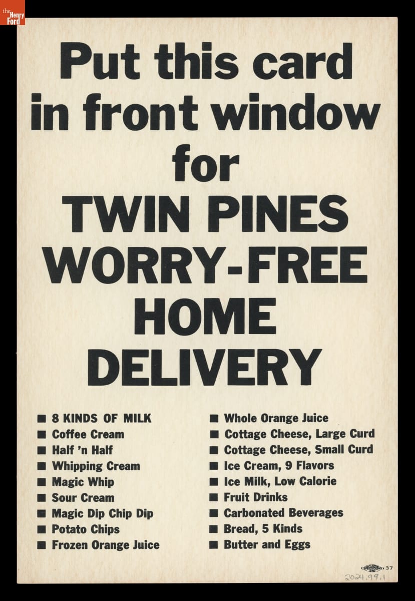 Twin Pines Dairy Home Delivery Window Card, 1965-1975