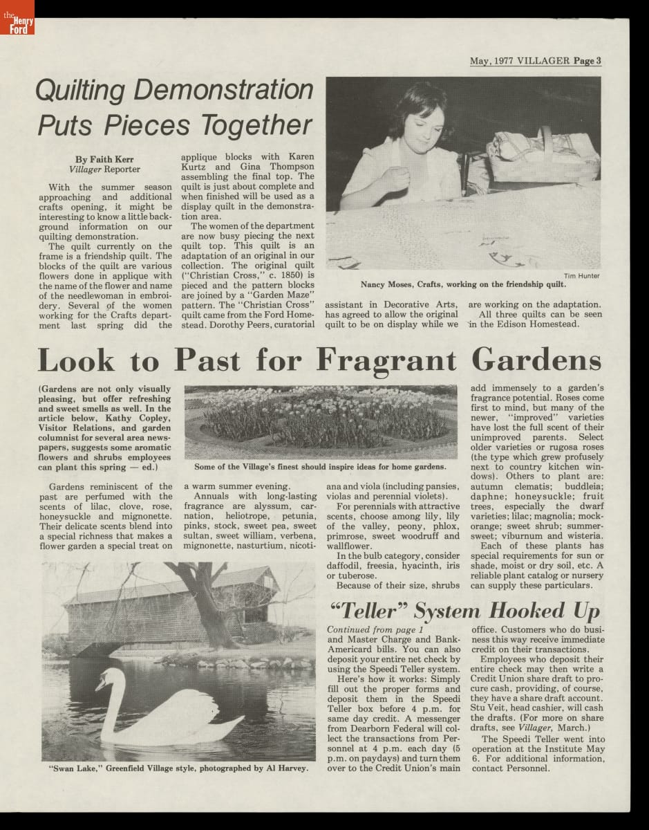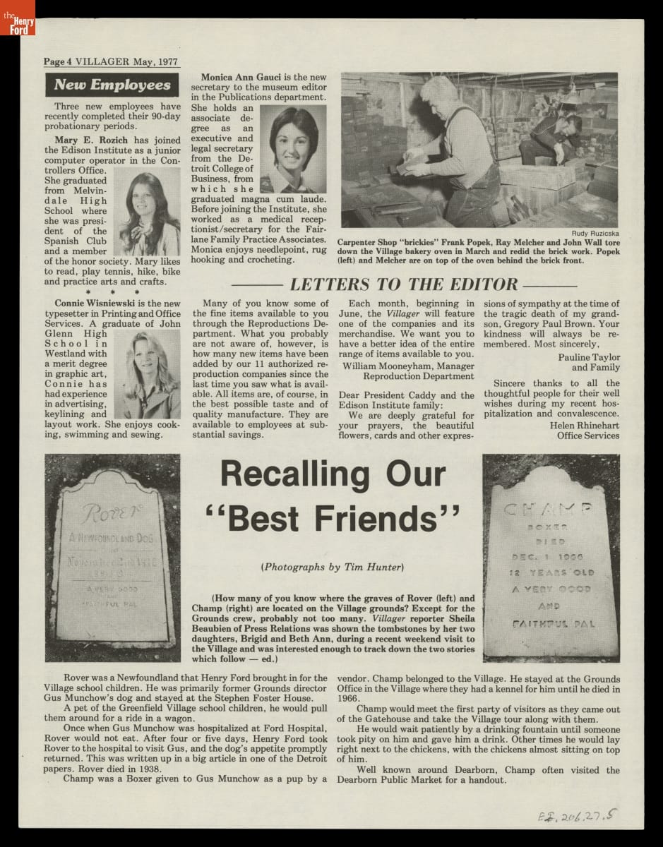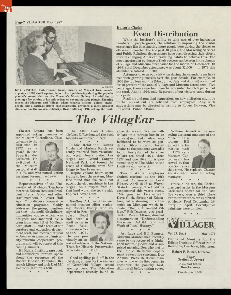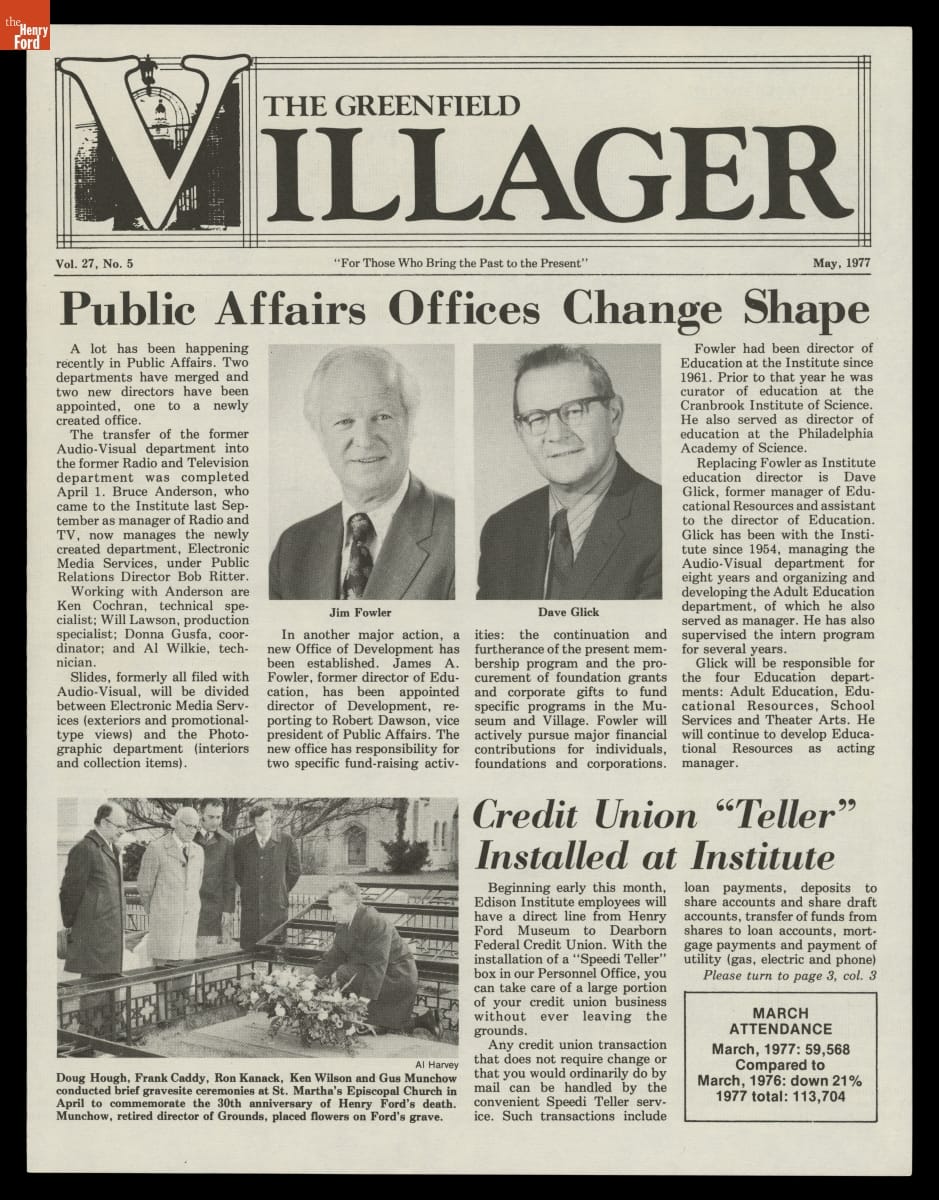 The Greenfield Villager was a regular publication of the Edison Institute created for its employees. First published in 1951, the newspaper kept employees abreast of institutional special events and acquisitions and provided information about employee recreational and educational opportunities, work benefits, and personal milestones. The last issue of The Greenfield Villager came out in 1981.