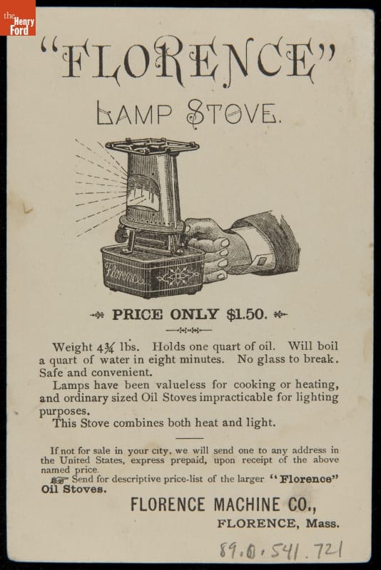 Trade Card for Florence Lamp Stove, Florence Machine Company, 1875-1885