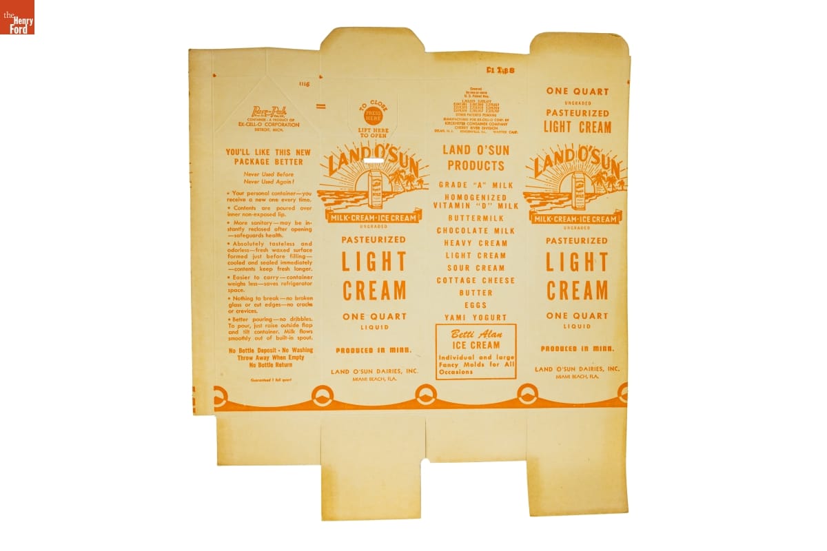 Manufactured for Ex-Cell-O Corporation, Detroit, Michigan, by the Kieckhefer Container Company, Cherry River Division, Delair, New Jersey, Bensenville, Illinois, and Whittier, California, for Land O' Sun Dairies, Miami Beach, Florida.