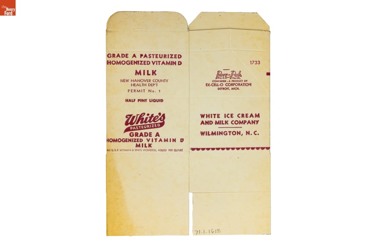 Manufactured for Ex-Cell-O Corporation, Detroit, Michigan, by the Kieckhefer Container Company, Cherry River Division, Delair, New Jersey, Bensenville, Illinois, and Whittier, California, for White Ice Cream and Milk Company, Wilmington, North Carolina.