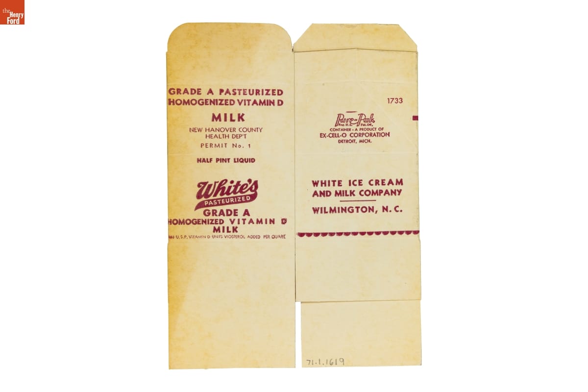 Manufactured for Ex-Cell-O Corporation, Detroit, Michigan, by the Kieckhefer Container Company, Cherry River Division, Delair, New Jersey, Bensenville, Illinois, and Whittier, California, for White Ice Cream and Milk Company, Wilmington, North Carolina.